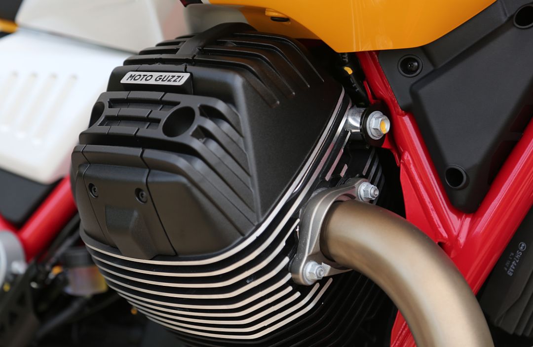 V85 TT搭載了全新升級的Moto Guzzi 90°橫置V型雙缸風(fēng)冷發(fā)動機(jī),排量為853mL,壓縮比10.5:1,缸徑與行程為84×77mm。官方聲稱這是自家同級別發(fā)動機(jī)中最現(xiàn)代化的,內(nèi)部結(jié)構(gòu)采用了全新的設(shè)計并應(yīng)用了一些賽車材料,雖然在外觀上來看這臺發(fā)動機(jī)與Moto Guzzi V9 Roamer與V9 Bobber系列似乎區(qū)別不大,但實(shí)際上59kW(80hp)/7750rpm的最大功率以及5000轉(zhuǎn)就可以爆發(fā)出80N·m的最大扭矩確實(shí)高出同排量的V9車型不少,更大的扭矩輸出也為V85 TT征服不同路況提供充足的驅(qū)動力。