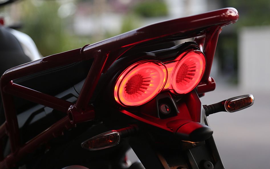 V85 TT的大燈設(shè)計可以說是整車最鮮明的特征之一,不僅讓人過目難忘,還能提供良好的照明效果。左右兩個大燈中間巧妙融合了Moto Guzzi風(fēng)格化的鷹形標(biāo)志作為連接,增強(qiáng)了大燈燈組的整體感,同時這只老鷹還兼具了位置燈與日行燈的功能。大燈還配置了單獨(dú)的保護(hù)杠,以防止在倒車時摔壞大燈。尾燈的設(shè)計也呼應(yīng)了頭燈的雙圓造型,點(diǎn)亮之后,漩渦狀的3D燈光效果猶如戰(zhàn)斗機(jī)引擎的火焰效一般,辨識度極高。V85 TT全車燈光都采用了LED光源,同時轉(zhuǎn)向燈還帶有貼心的自動取消功能,防止忘記關(guān)閉或者誤操作對其他駕駛者判斷造成干擾。
