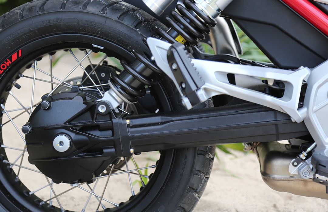 V85 TT采用了鋼管車架,同時這臺橫置V缸發(fā)動機(jī)也作為車架的一部分參與受力,減輕車重的同時也達(dá)到更好的鋼性,同時省去了下方的車架后,在配有發(fā)動機(jī)護(hù)板的情況下仍然提高了整車離地間隙。由于V85 TT采用軸傳動,所以后搖臂為非對稱式的設(shè)計,右側(cè)粗壯的搖臂內(nèi)容納了軸傳動裝置,軸傳動的傳動方式比鏈條更加堅固可靠,同時還具有免維護(hù)的優(yōu)勢,顯然十分適合V85 TT的定位。為了平衡配重,排氣部分放在了車輛左側(cè),左側(cè)搖臂采用了彎曲的造型為排氣留出空間。