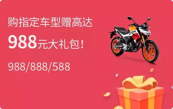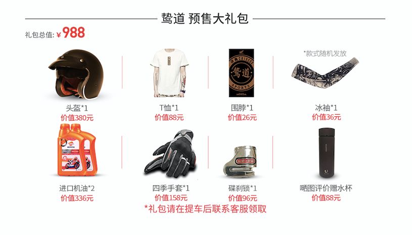 購買指定車型,贈送588元,888元,988元大禮包!所有禮包都包含頭盔,機(jī)油,騎行手套以及碟剎鎖,滿足出行的需求哦~曬圖評價還加贈雨傘/保溫杯!