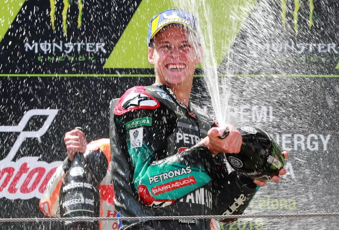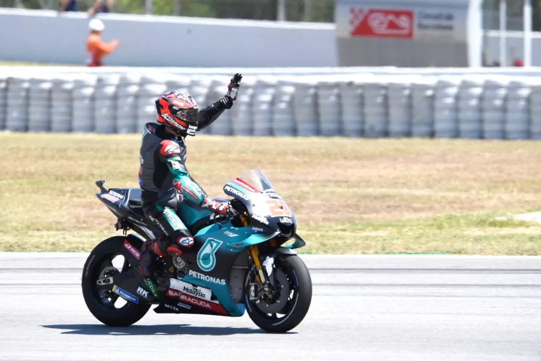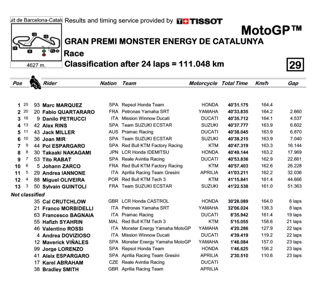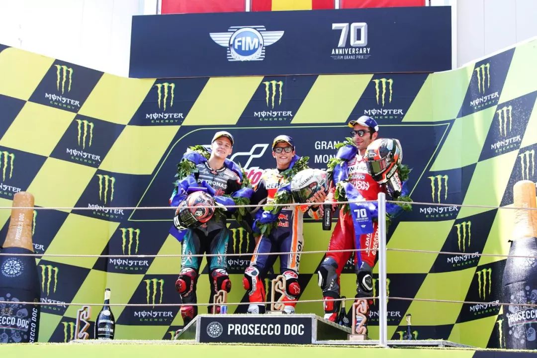 最終,馬昆斯在無(wú)人威脅之下、奪得了加泰羅尼亞站的勝利,這是他在本賽季的第四個(gè)分站冠軍。經(jīng)過(guò)了一翻激戰(zhàn),Yamaha 馬國(guó)油 SRT 車(chē)隊(duì)的小將寇塔拉羅、擠掉了另外兩支工廠車(chē)隊(duì)的車(chē)手奪得了第二,為自己、也為這支新的 Yamaha 衛(wèi)星車(chē)隊(duì)奪得了首次登上頒獎(jiǎng)臺(tái)的機(jī)會(huì)。在上一站意大利木杰羅奪得了首次冠軍的佩魯奇,搶到了頒獎(jiǎng)臺(tái)上的最后一個(gè)位置、獲得了第三。