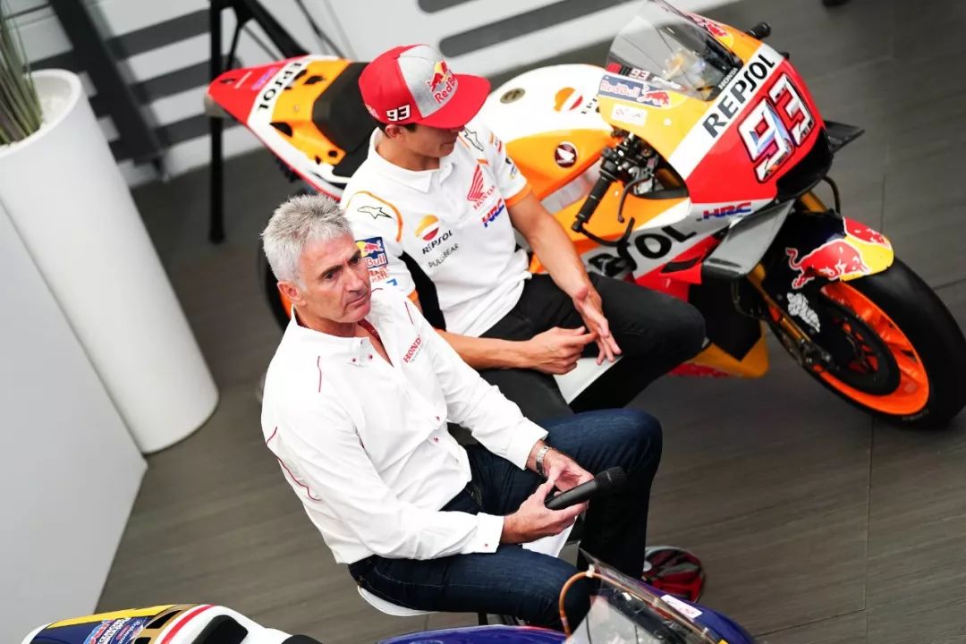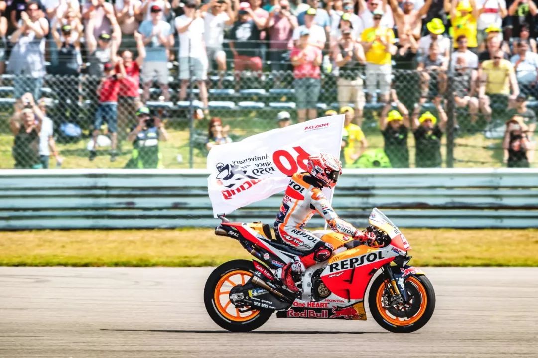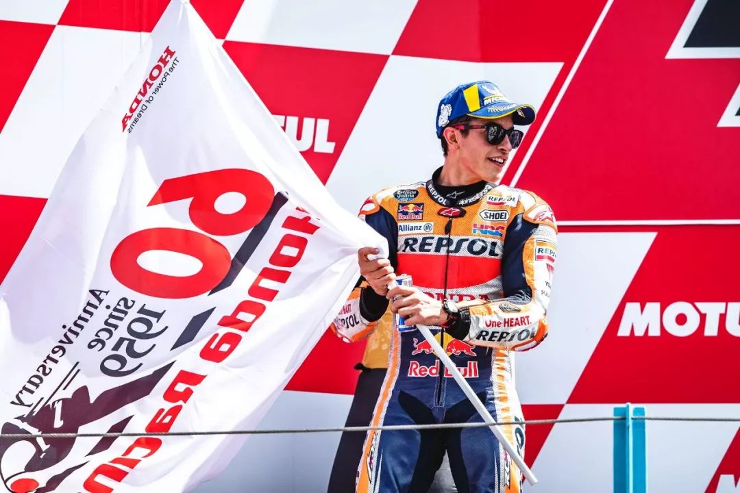 MotoGP 級別的比賽結(jié)束后,馬昆斯也拿了一面 Honda 參賽 WGP 六十周年的大旗跑了一遭。