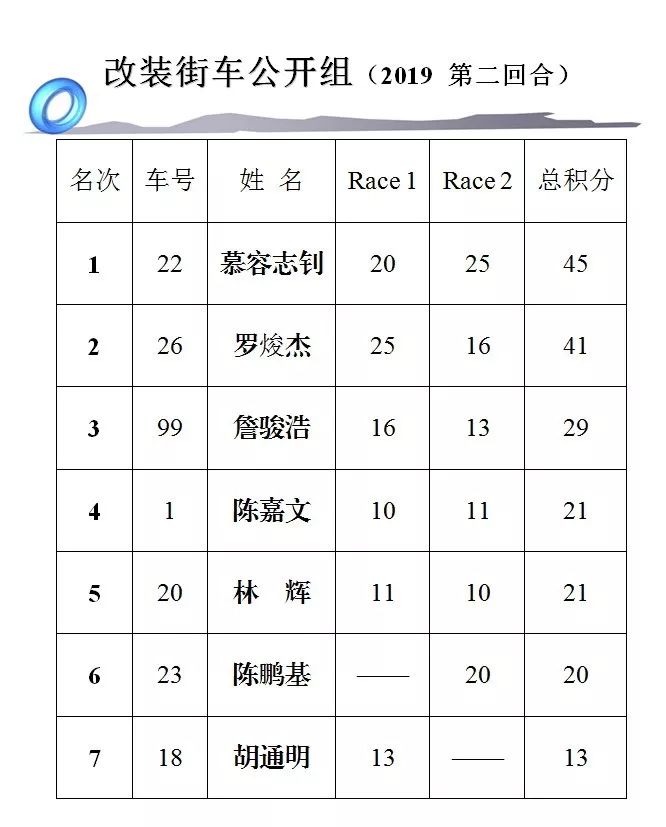 總計兩節(jié)比賽的成績,慕容志釗奪得了第二回合、改裝街車公開組的冠軍,羅焌杰獲得了第二,有著穩(wěn)定表現(xiàn)的詹駿浩獲得了第三。
