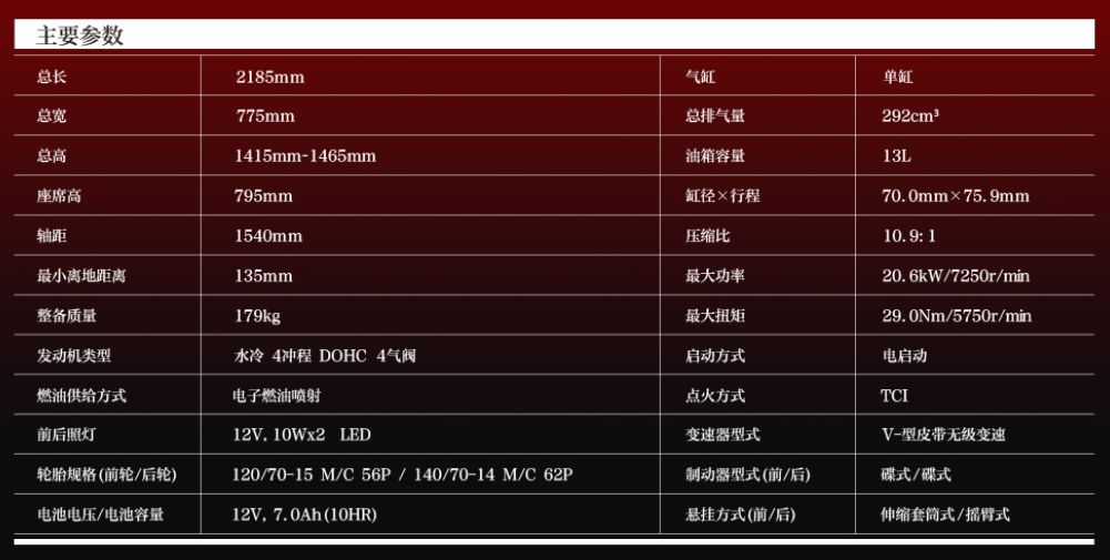 而這款車最大的魅力點還是在這臺293mL水冷SOHC發(fā)動機上,采用雅馬哈“創(chuàng)核科技”技術(shù),20.6kW最大功率和29N·m的最大扭矩配合179kg的車重還是讓你感受到不俗的運動性,同時最大功率和扭矩也是目前國內(nèi)同級別踏板車中最大的。
