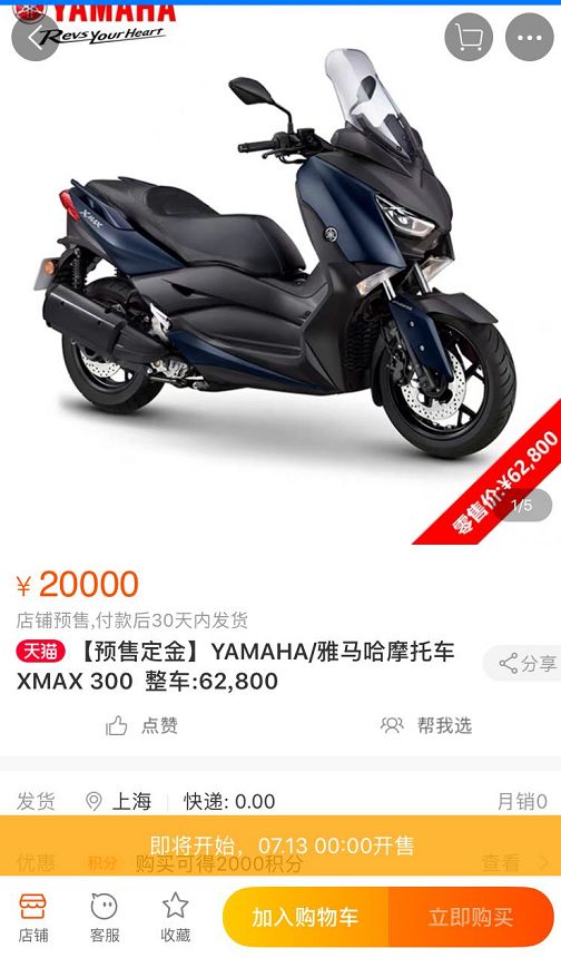此次雅馬哈XMAX 300將于7月13日零點在雅馬哈天貓旗艦店開售,前50名線上支付定金的用戶將獲贈價值708元雅馬哈騎行套裝一份!有意向的車友現(xiàn)在就可以先加入購物車了!