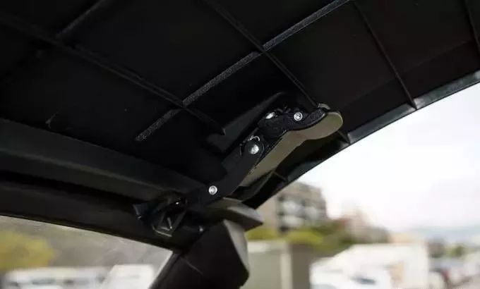 車頂展開后將前緣插入前擋風(fēng)鏡的凹槽再固定下方的左右兩個固定扣.便完成了車頂?shù)陌惭b整體的操作十分簡單.相信熟練之后在一分鐘之內(nèi)就可完成安裝或拆卸
