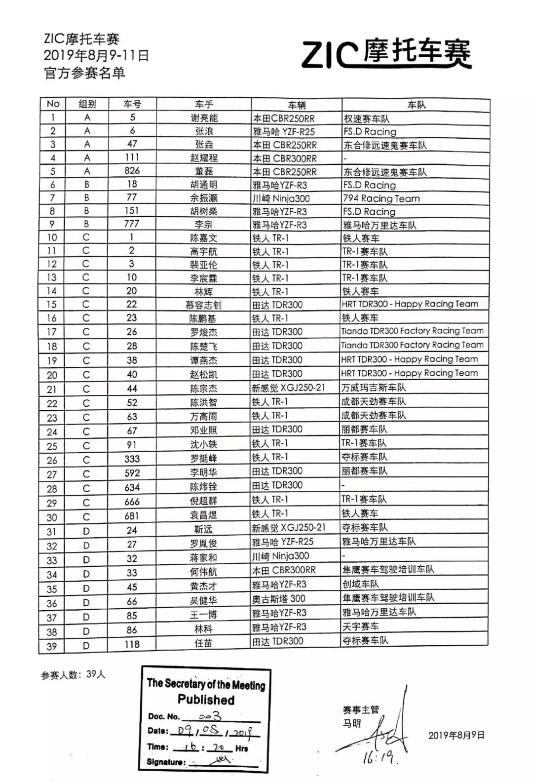 ZIC摩托車賽官方參賽名單