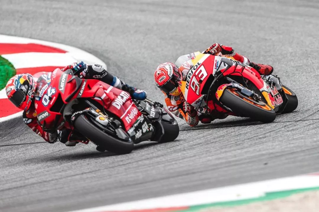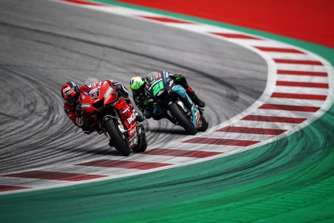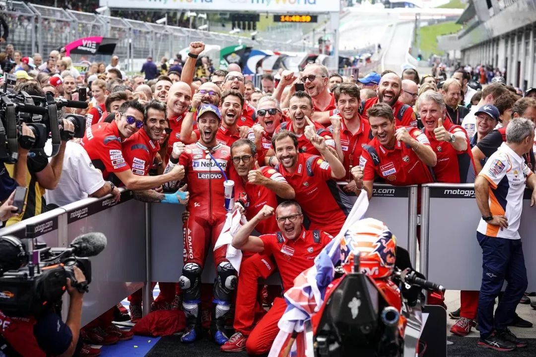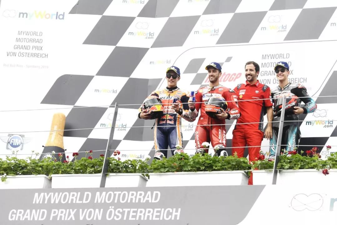 最后的三圈,已經(jīng)跑在前面、拋離了后車的馬昆斯與杜維斯奧索重演了 2017 年時候的較量。最后一圈的最后一個彎道,杜維斯奧索的冒險一擊,助他成功奪得了本站的勝利。杜維斯奧索的勝利,讓杜卡迪延續(xù)了他們在奧地利這條 Spielberg 斯皮博格賽車場自 2016 年重返 MotoGP 以來的不敗記錄:恩諾尼在 2016 奪冠,杜維斯奧索在 2017 年險勝,在去年則是羅倫索。