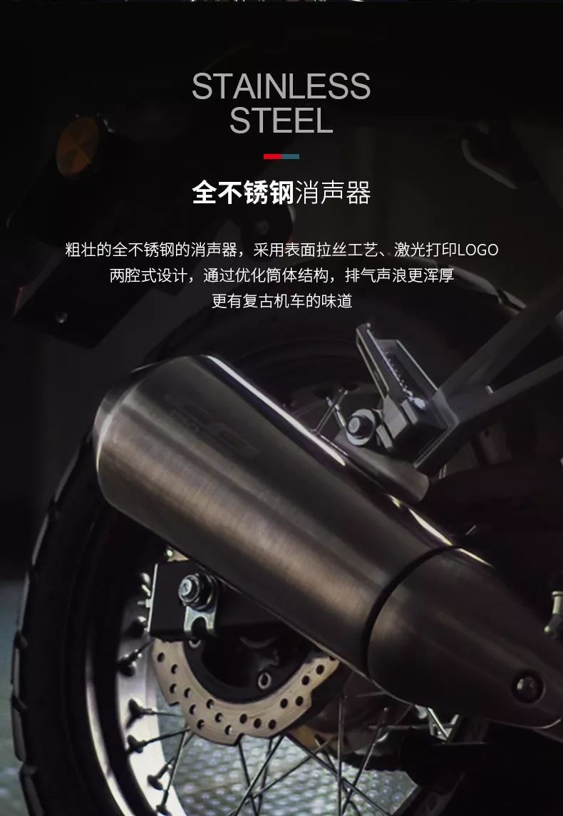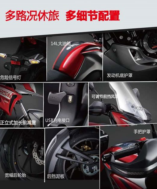 猛鷙190則是五羊-本田推出的主打摩旅市場的車型,猛鷙190和此前的CB190R有著諸多不同,首先外形和此前的CB190R完全不同,頭燈的面積更大,油箱兩側(cè)的護(hù)板也變得大氣了很多。其次是減震,這款車的前減震采用了正立式,并加長了行程,減震效果并不比倒置減震差。最重要的是這款車的最小離地間隙從138mm增加到了160mm。在一些配置上,風(fēng)擋、護(hù)手、USB、邊箱等配置方便了旅行,油箱從12L增大到14L,儀表也進(jìn)行了更換,同時(shí)金屬的發(fā)動機(jī)下護(hù)板以及高位排氣又為這款車在旅行途中提供了更多保障。最后一點(diǎn)就是,增加了這么多配置之后,這輛車的整備質(zhì)量為141kg,只比CB190R多了1kg。在最近升級的國四版猛鷙上,還增加了前輪ABS、儀表擋位顯示等更多實(shí)用配置,讓猛鷙更好地滿足摩友需求。