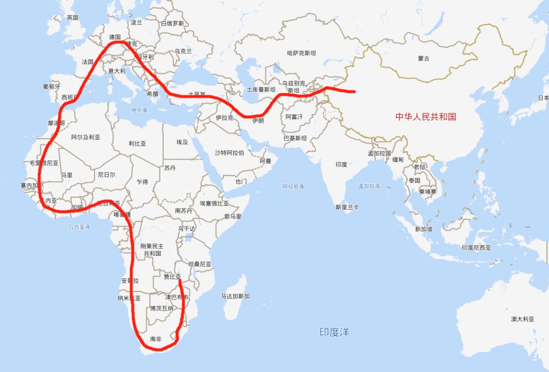 從中國(guó)新疆出發(fā),途徑塔吉克斯坦、烏茲別克斯坦、土庫(kù)曼斯坦、伊朗、土耳其、歐洲大陸,最后來(lái)到非洲大陸,沿著非洲海岸線前行,終點(diǎn)肯尼亞,總行程將超過(guò)2萬(wàn)6千公里。