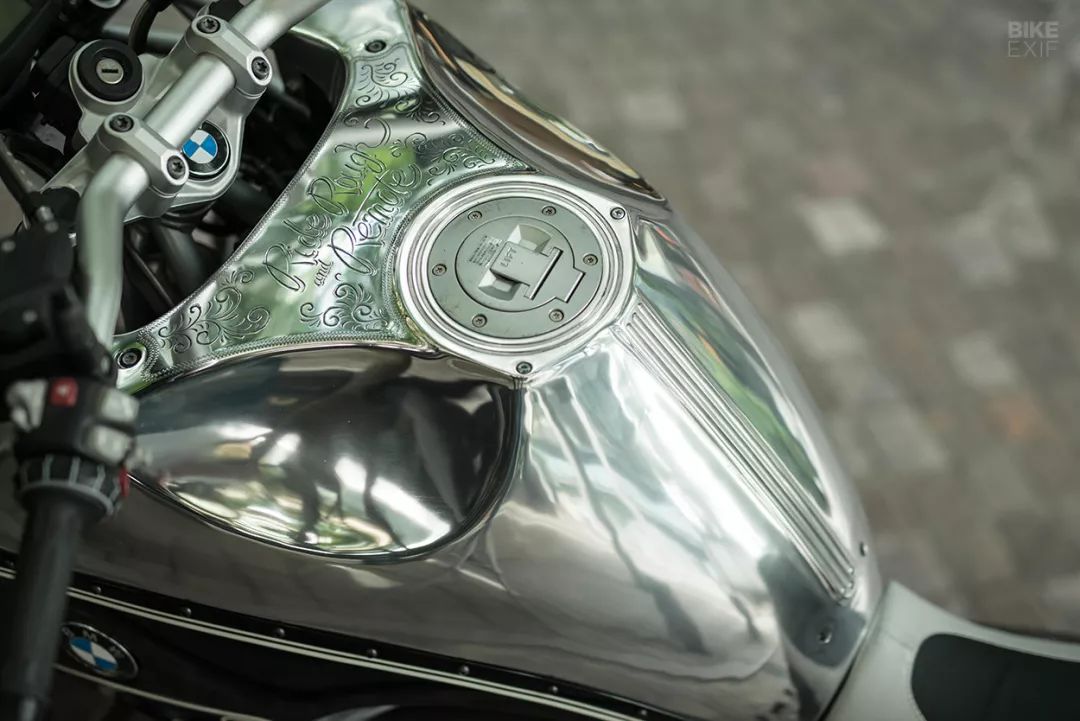 首先它將原有的“鳥嘴”去除,得到了一個(gè)全新的車頭造型,將原有大燈和儀表鑲在了這個(gè)新的造型上,并融入到了整車的外觀中。全新的油箱造型改變了這款車原有的風(fēng)格,除了手工雕刻的花紋以外,亮漆質(zhì)感和全新的造型為這款車增添了幾分朋克元素。