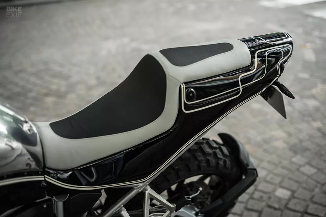 整車的動(dòng)態(tài)依舊是Kaichiro Kurosu標(biāo)志性的前傾造型,這從它早期的哈雷以及寶馬作品中不難看出端倪。車身的造型更加簡(jiǎn)潔,油箱下的邊板和尾部在造型上連成一體,白色的線條貫穿車身,增顯動(dòng)感,黑白配色也讓這款車與眾不同……總之可能會(huì)有人覺得它是個(gè)“怪物”,但它絕對(duì)個(gè)性。