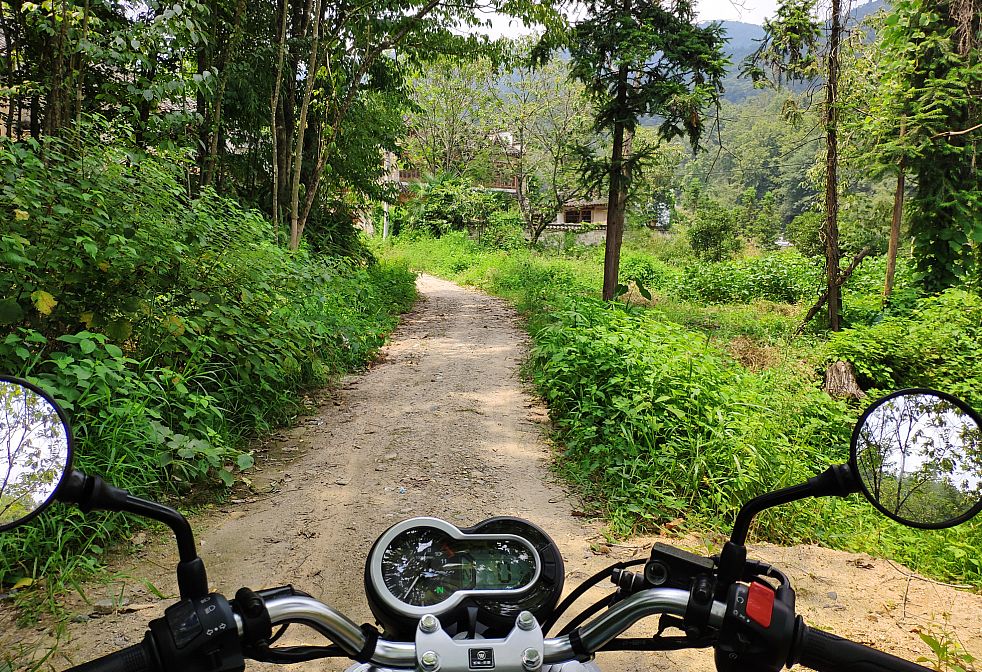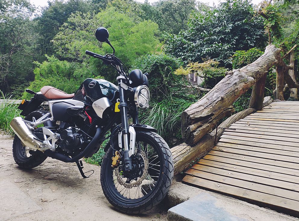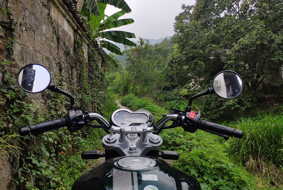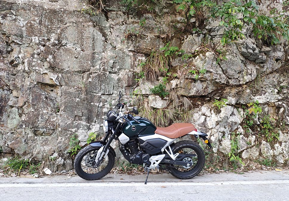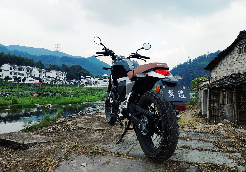 在一路尋幽探秘的過程中,我?guī)缀醢漾v道CB190SS當作Scrambler車型在騎,密布的巷道橋梁十分狹窄,最寬處不過一米多,村落深處,石板路便成了凹凸不平的石子路、砂石路,時不時還有很大的起伏。河邊小路經常一邊靠墻,另一邊就是溪谷。鷙道CB190SS輕巧的操控沒有給我?guī)砀嗟膲毫?,正如前面所說,輻條輪龜背胎以及190mm的高離地間隙,讓這款車有了更多的適應性和可玩性。值得一提的是,鷙道CB190SS前減震的反饋雖然硬朗了不少,但通過溝溝坎坎時給騎手的感受卻很平和不突兀,加上輻條輪轂和較厚的坐墊,使整車對顛簸的濾震性很好。另外大家所詬病的后制動沒有配備ABS,在這種砂石泥土的非鋪裝路面上反而是最大的優(yōu)勢。