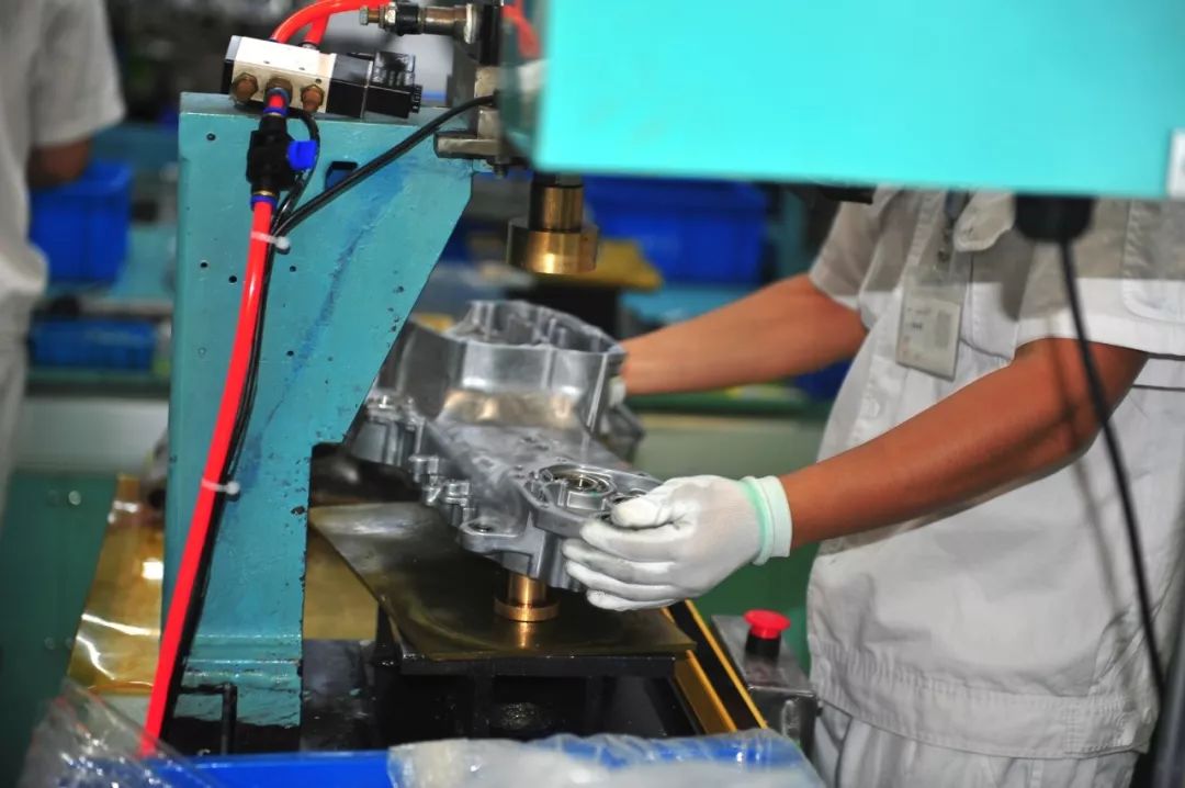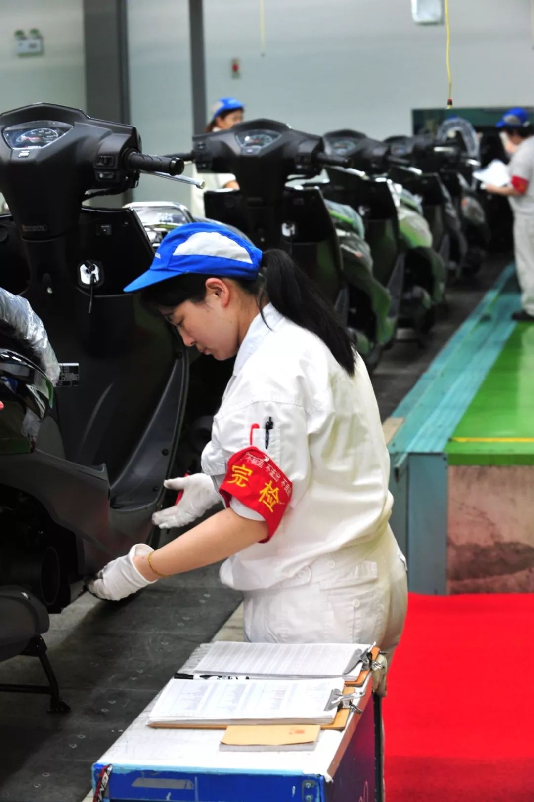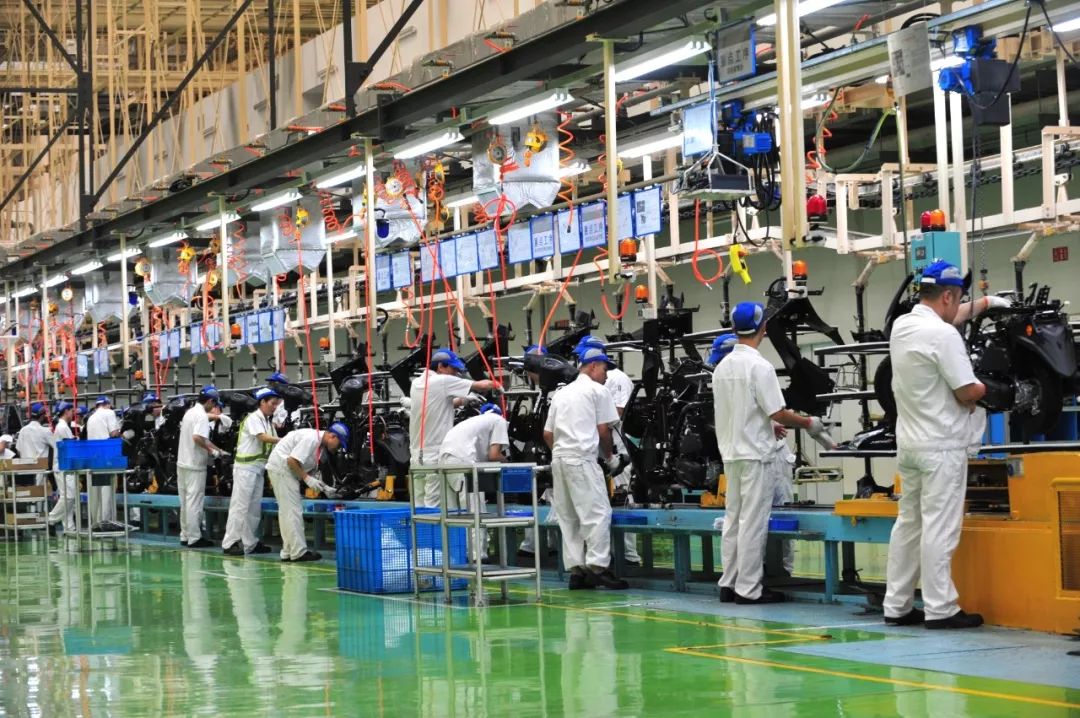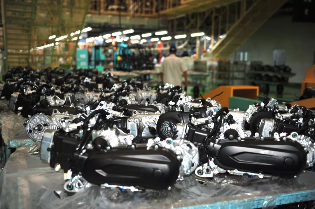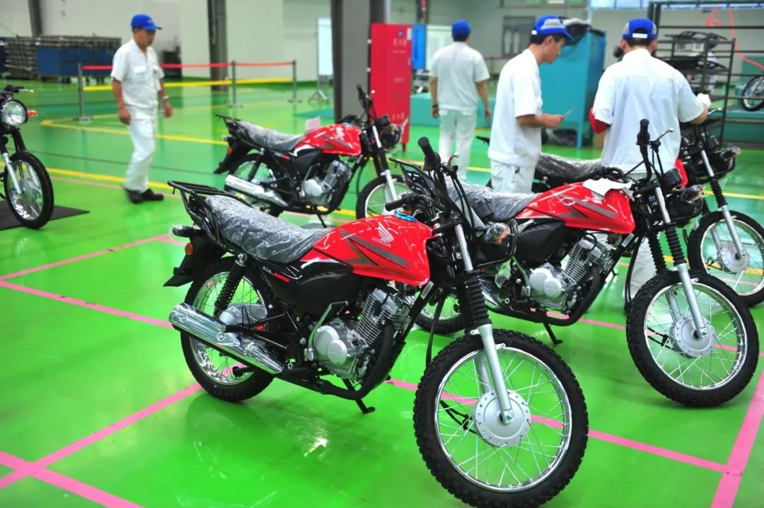 進入寬敞高大的車間,遠遠看見生產(chǎn)線上正在忙碌著。這個車間里有好幾道生產(chǎn)線,從發(fā)動機組裝到各款整車組裝同時進行。工人們對我們的到來視而不見,每個人都在自己的工位上有條不紊。左側流水線上正在裝配紅色油箱的GL125,這是一款出口車型,銷往多個國家和地區(qū)。廠方陪同人員告訴我們:這條全新的跨騎車生產(chǎn)線不僅能生產(chǎn)125mL小排量車,還具備更大排量車型的能力。