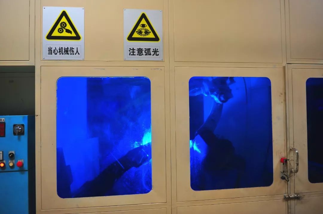 隔壁就是沖焊車間(沖焊課)。這個車間主要進行各款車型的車架焊接,采用機器人控制焊接和人工控制焊接相結合的方式——焊接面積大的重要部位由歐洲進口道軌配合日本進口沖焊機器人焊接;拐彎抹角的小焊點則由經(jīng)驗豐富的老員工操縱進口焊接設備進行人工控制的焊接。