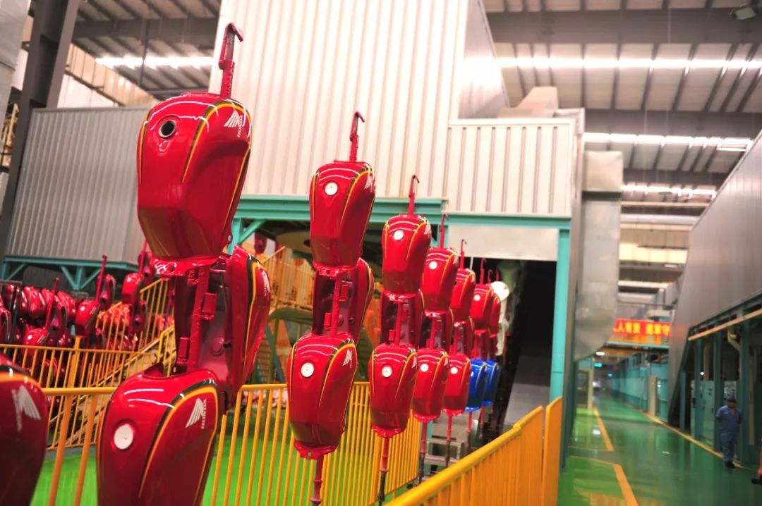 我們重點探訪了跨騎車油箱和外觀件的涂裝生產(chǎn)線。這是一條完全自動化的先進噴涂設備,這邊進去研磨過表面的毛坯油箱,那邊出來锃亮的成品油箱,整條機械集調漆、噴涂、烘干、傳送于一體,還可以精確調配溫度、濕度、時間以及各種模式,高效、高質、環(huán)保。如此高的自動化車間也需要人來把關——在一些關鍵工序中,你會看到嚴陣以待的員工,正在時刻關注著機器的工作狀態(tài),隨時準備進行調整,確保萬無一失!過了他們這一關之后,成品油箱還要進行最后的質檢才能進入整車裝配車間。