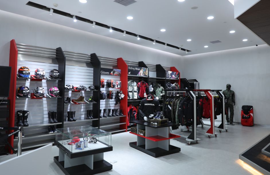 杭州店總面積1500平方米,以「縱享都市感、時尚感,‘樂享騎行生活’的Honda Road」為設計理念。整店設計風格引人遐想,給人以馳騁于賽道之感。秉承著「讓顧客體驗Honda摩托車世界」的夢想、體現(xiàn)Honda獨有品牌文化—“夢想”、“技術”、“信賴”。杭州店設有七大區(qū)域:室內(nèi)有車型展示區(qū)、騎行裝備展示區(qū)、客戶活動區(qū)、休息洽談區(qū)、售后服務區(qū),室外有試駕區(qū)和客戶停車區(qū)。