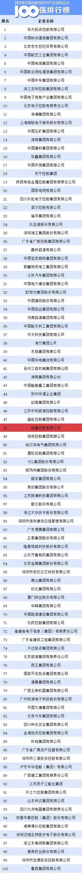 戰(zhàn)略性新興產(chǎn)業(yè)代表著未來科技和產(chǎn)業(yè)發(fā)展新方向,體現(xiàn)當今世界知識經(jīng)濟、循環(huán)經(jīng)濟、低碳經(jīng)濟發(fā)展潮流,是對經(jīng)濟社會具有全局帶動和重大引領作用的產(chǎn)業(yè)。近日,中國企業(yè)聯(lián)合會向全社會發(fā)布《2019中國戰(zhàn)略性新興產(chǎn)業(yè)領軍企業(yè)100強排行榜》,華為投資控股有限公司名列首位。隆鑫控股有限公司列第48位,成為重慶市唯一一家上榜企業(yè)。