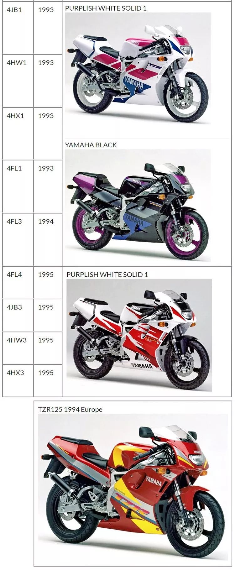 下圖:除了 1993 款(4FL)之外、Yamaha TZR125 在亞太地區(qū)市場(日本生產(chǎn))的各代車型工廠編號。