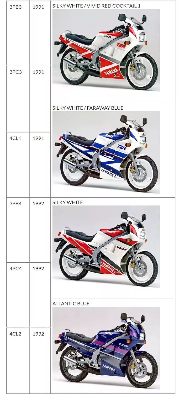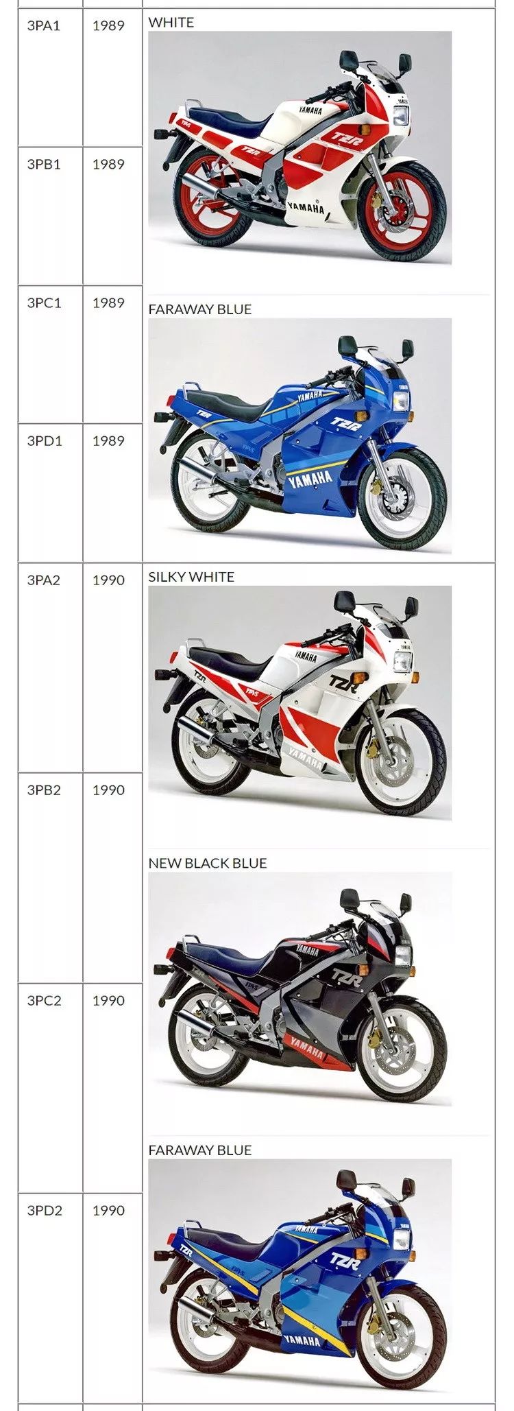 下圖:Yamaha TZR125 在歐洲市場(日本生產(chǎn))的各代車型工廠編號。