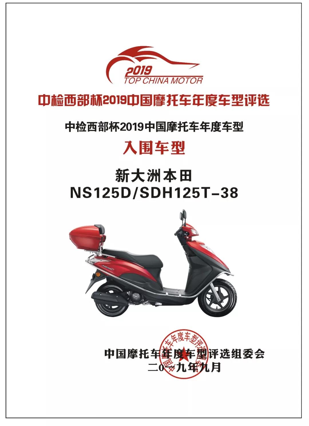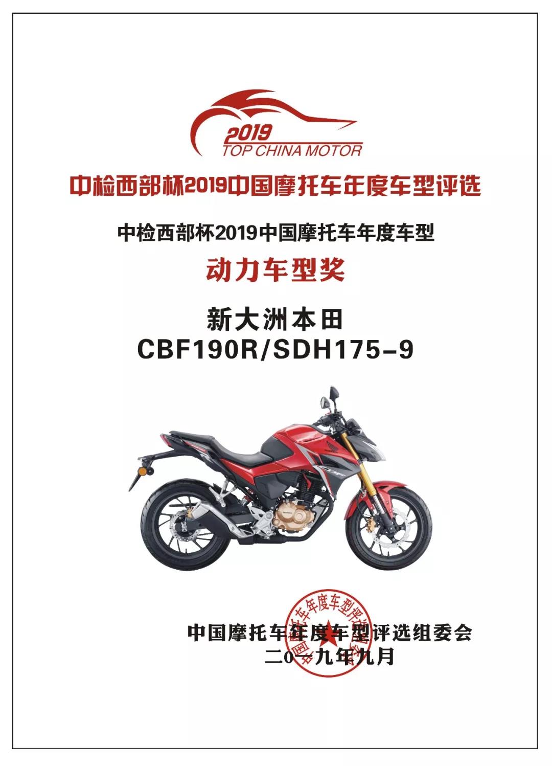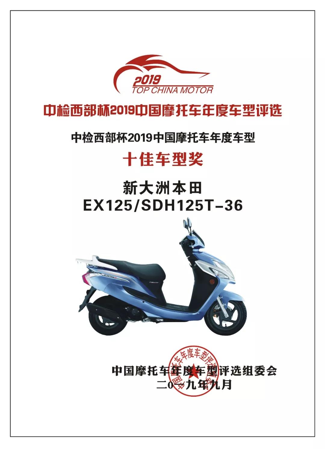 2019年9月20日,“中檢西部杯” 2019 中國摩托車年度車型評選活動的頒獎典禮在重慶第十七屆中國國際摩托車博覽會摩友之夜上落下帷幕。新大洲本田選送的新上市的四款產(chǎn)品:EX125、CBF190R、電摩V-GO及NS125D,在本次評選活動中與18家參評企業(yè)選送的25款燃油摩托車產(chǎn)品及11家電動車品牌、13款電動摩托車產(chǎn)品中脫穎而出。在經(jīng)過了節(jié)能、動力、安全、外觀、舒適、操控等六項專業(yè)項目的檢驗及評價以及通過持續(xù)一個月多的網(wǎng)絡(luò)投票、媒體俱樂部投票,最終結(jié)合專業(yè)檢測、車友試駕結(jié)果等諸多方面的綜合比后,EX125奪得2019年年度十佳車型大獎第一名,CBF190R獲得年度動力車型獎,V-GO獲得電動摩托車十佳車型獎及NS125D獲得年度車型入圍獎!得到了中國汽車工業(yè)協(xié)會摩托車分會、國家摩托車質(zhì)量監(jiān)督檢驗中心以及多家各大社會、摩托車專業(yè)媒體、和來自全國各地的機車俱樂部和眾多車迷代表的一致認可。