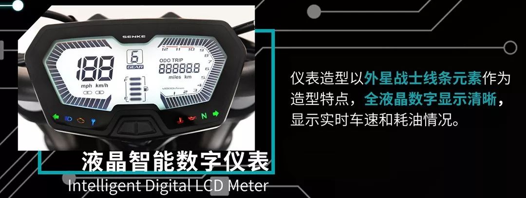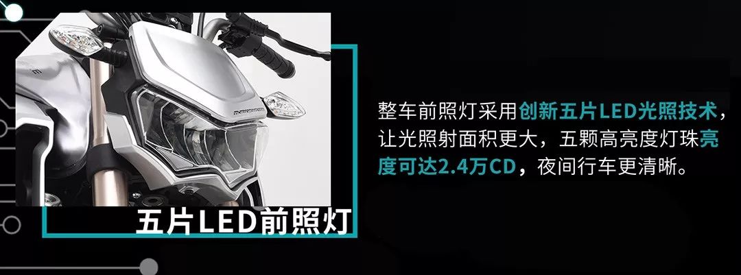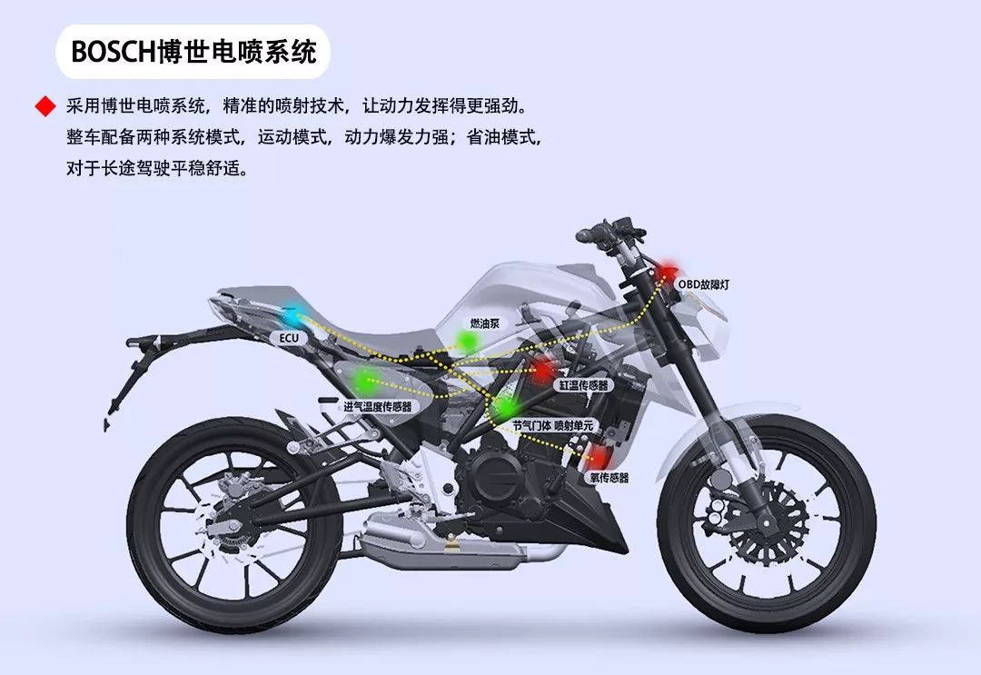 搭載全新250水冷雙頂置凸輪四氣門DOHC發(fā)動機(jī),配合博世智能電噴系統(tǒng),其最高功率達(dá)19.5kw/9000r/min,爆發(fā)力完美輸出的同時整車振動性小、高速穩(wěn)定。