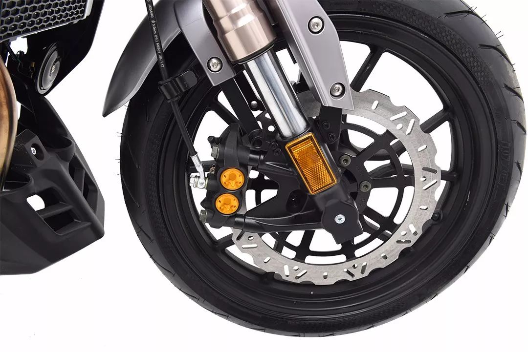 前碟剎采用對向四活塞對置卡鉗和輕量化剎車盤,提升制動性能的同時減輕整車重量;前減震為加粗倒置減震。