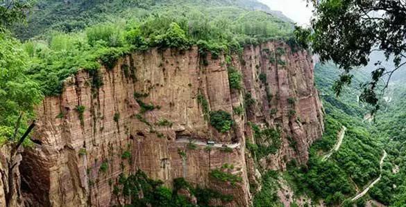 我國共有七條掛壁公路,位于南太行山地區(qū)晉東南。太行山北高南低,山勢東陡西緩,西翼連接山西高原,東側(cè)為明顯的斷層,許多地段形成近1,000公尺的斷層巖壁,氣勢雄偉。河南省新鄉(xiāng)市輝縣沙窯鄉(xiāng)郭亮掛壁公路于1972年3月9日開工,1977年5月1日通車。其寬6米、高4米,長1300米,是在110米高、1250米長的絕壁橫面上,以25度斜面鑿出的人工隧道。當(dāng)年,郭亮村共投資8萬元鑿洞,2001年又投資40萬元進行了擴修。絕壁屬沉積砂巖,硬度達到8.2級,屬最硬的一種石頭,郭亮掛壁公路平均作業(yè)高度105米,從絕壁中間炸開工作面,外側(cè)的35個天窗,當(dāng)初是為了便于排碴和作業(yè),如今成為通風(fēng)透光的觀景臺。