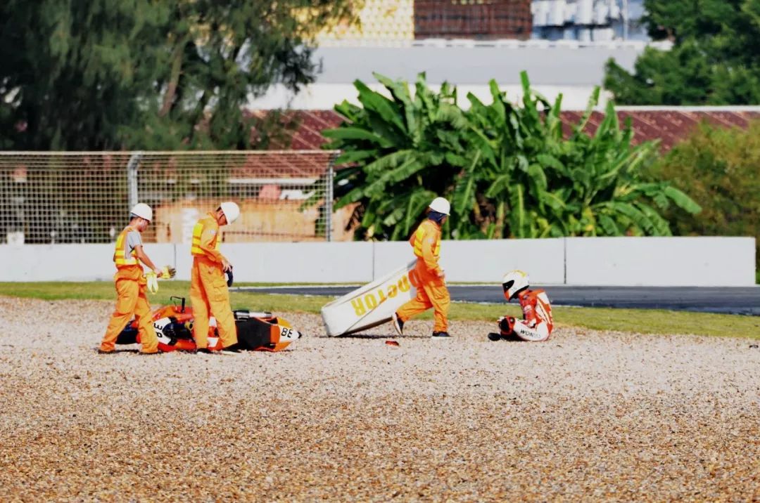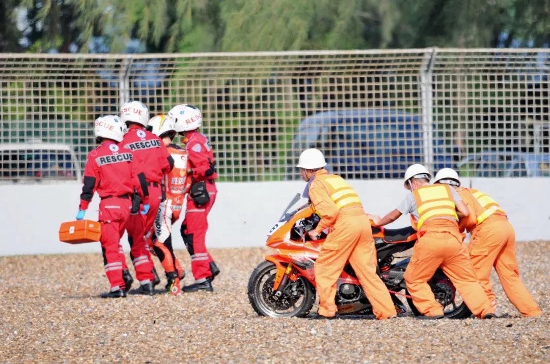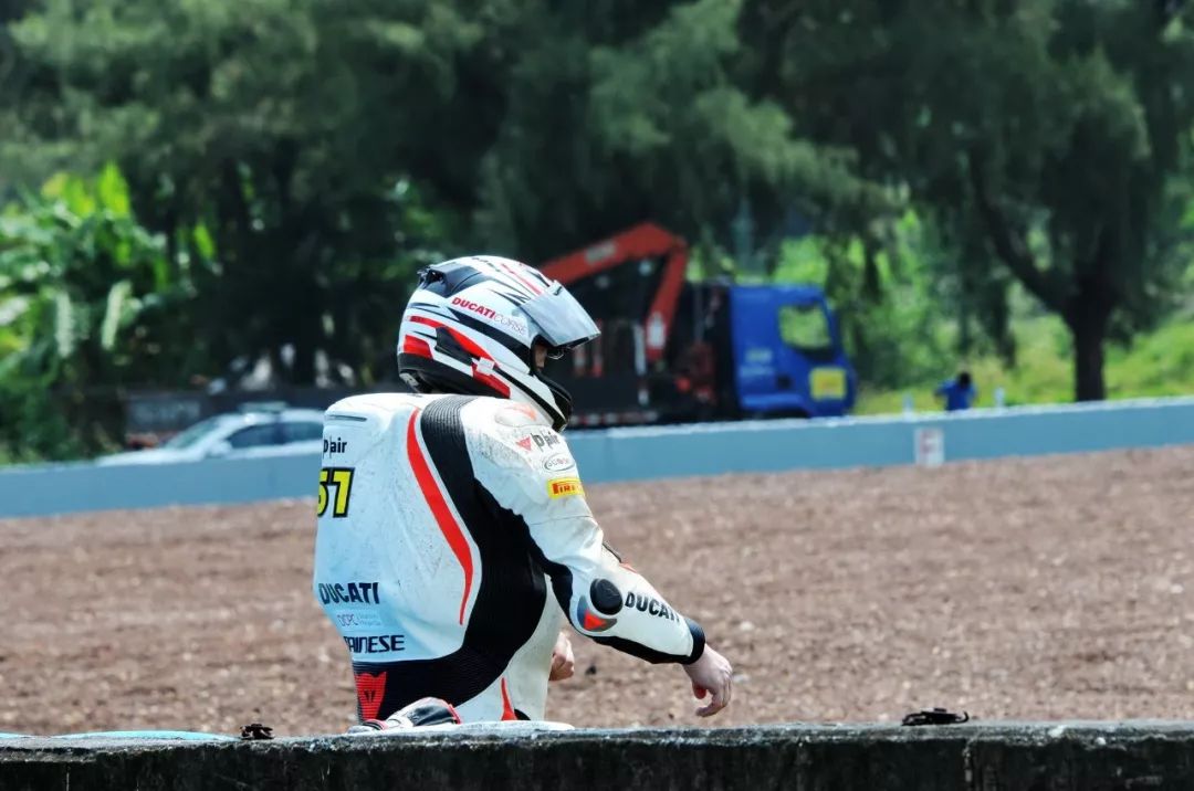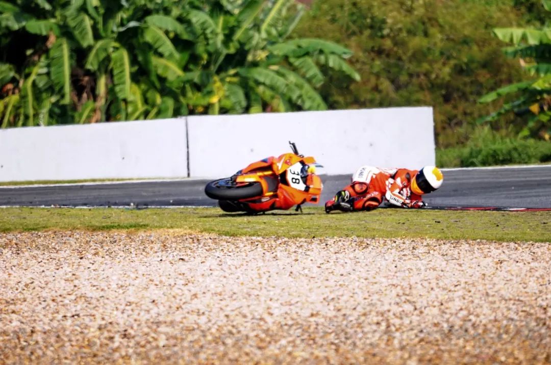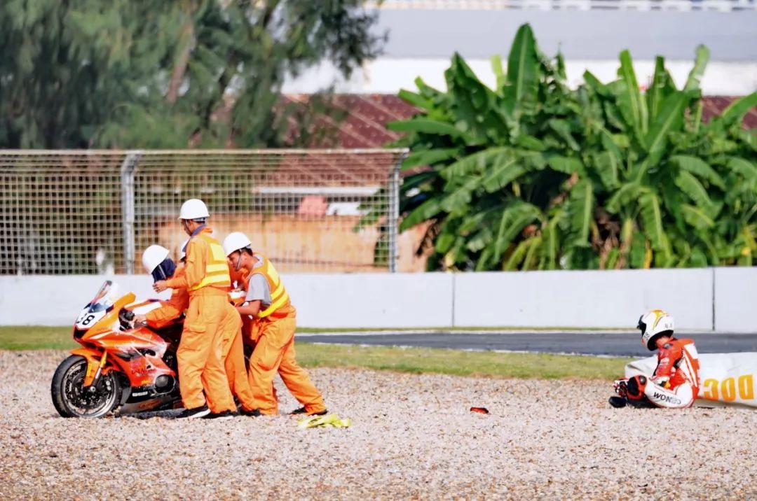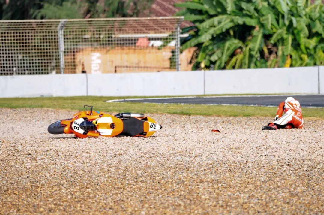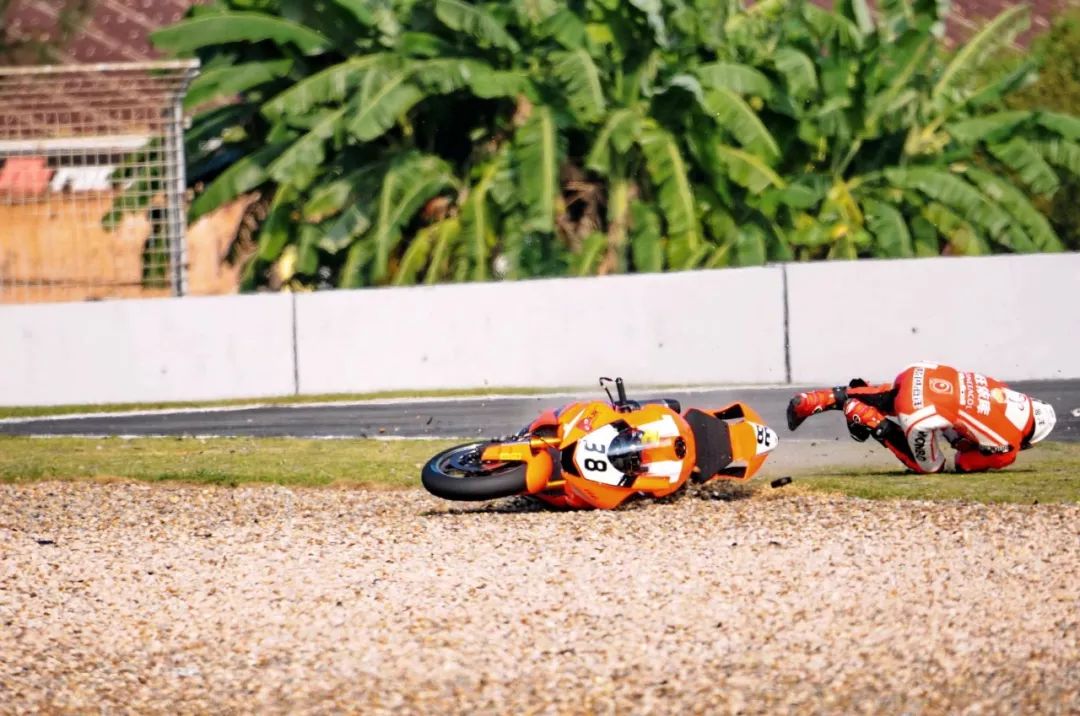 競爭激烈之下,不論是速度英雄(摩托車組)、還是 DCPC 杜卡迪(中國)超級杯挑戰(zhàn)賽,都發(fā)生了多次的摔車。得益于無論是場地設(shè)施還是車手的個人裝備,車手基本都無甚大礙,幾乎就是拍拍身上的塵土、就能自行回到自己的位置上。