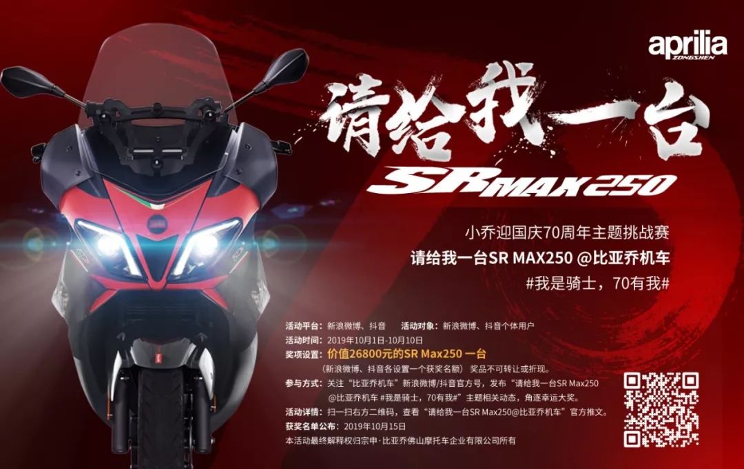 如參賽者為zongshen-PIAGGIO、zongshen-aprilia品牌車型車主,可上傳本人駕乘zongshen-PIAGGIO、zongshen-aprilia品牌車輛的視頻或圖片,文字輸入框輸入請給我一臺SR Max250@比亞喬機車#我是騎士,70有我#,發(fā)布抖音動態(tài);