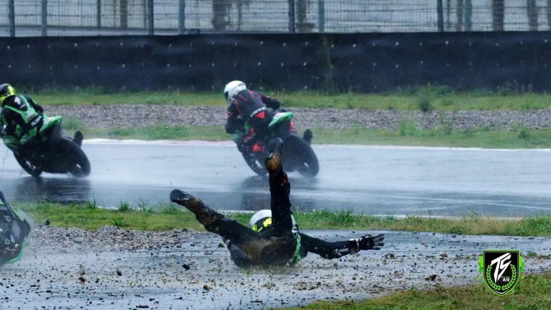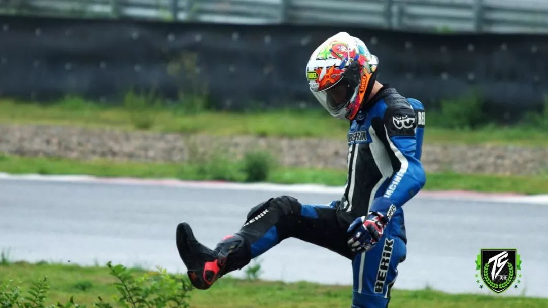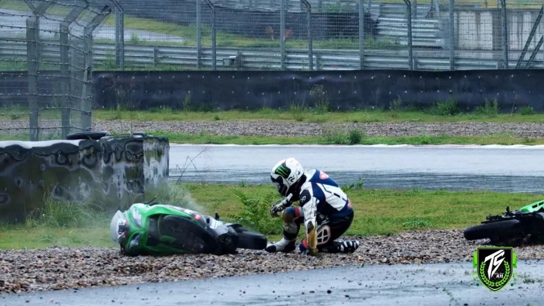Kawasaki Ninja 250 統(tǒng)一組,正式比賽在雨勢較大的時(shí)候進(jìn)行,其他各個(gè)組別的比賽也在間歇性的陣雨中追逐,整個(gè)比賽日的下午,跑道的路面都處于濕滑的狀態(tài)下。貴陽駿馳賽車場的 T4、T5,是一個(gè)連續(xù)的下坡 S 彎,雨水從坡頂?shù)?T2 順著賽道往下流淌,雨中的比賽,這是一處充滿了挑戰(zhàn)的險(xiǎn)要之地。