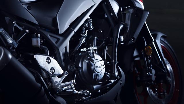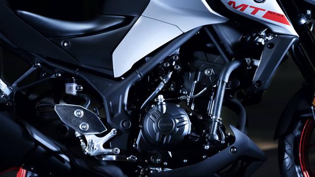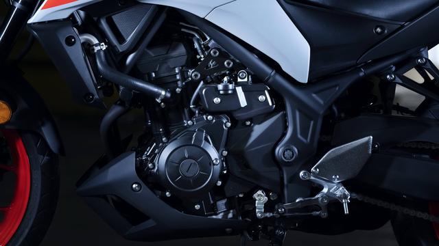 新的 MT-03 沿用了此前的水冷四沖程直列兩汽缸、DOHC 每汽缸四汽閥的發(fā)動機(jī),缸徑、行程為 68 mm × 44.1 mm(MT-25 的缸徑、行程為 60 mm × 44.1 mm),排汽量 321 cc,最大動力輸出 31 kw(約 42 匹。而 MT-25 的最大動力輸出為 26.5 kw)。