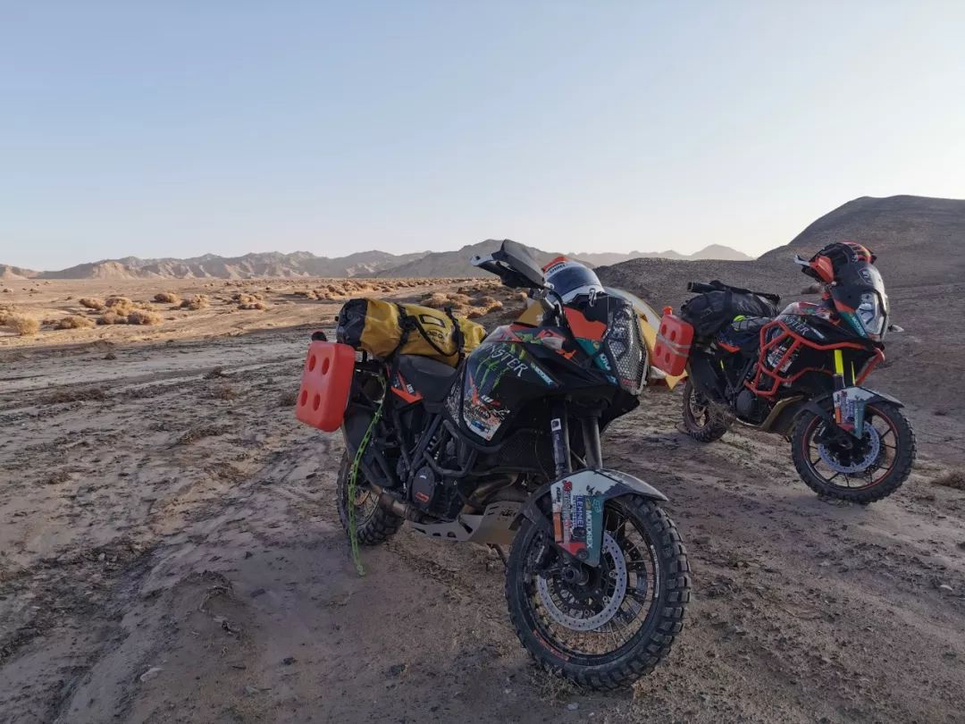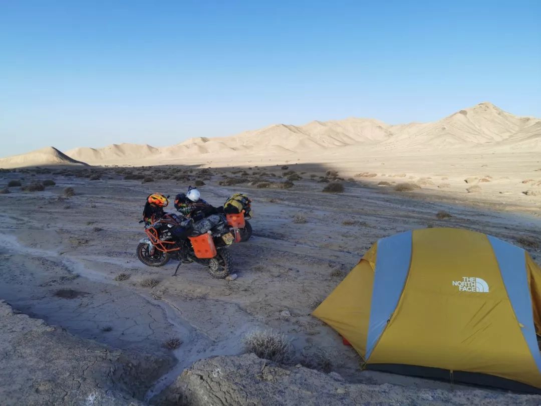 我們趕緊找了個相對安全的地方扎營,風太大了帳篷差點被掀翻,只能用我們的愛車做錨點順便擋風,其實也算心里安慰吧,至少我們哥四個在一起——還有兩位KTM伙伴一路陪伴,任勞任怨任我們躁。