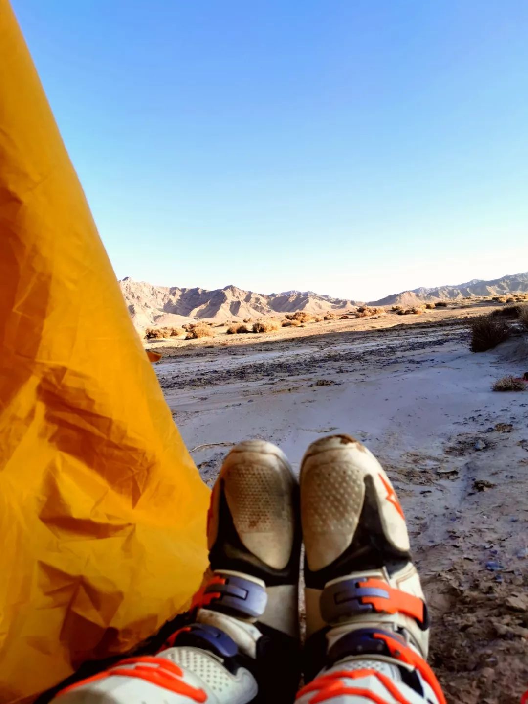 經(jīng)過戈壁和山丘路段,又是一次不堪回首的折磨。這種地面看似硬殼但其實踩上去非常軟,里面還有石塊,要比純粹的沙漠更費專注力,我倆都摔了好多跤。