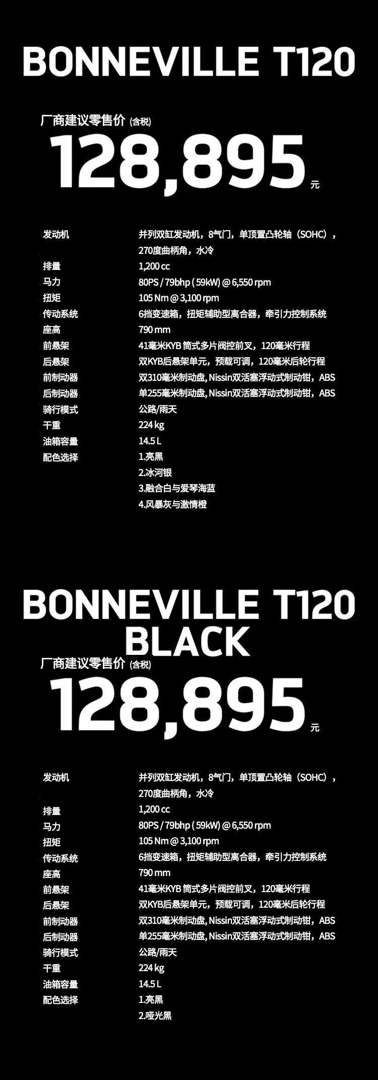搭載了排量900mL的并列雙缸8氣門(mén)水冷發(fā)動(dòng)機(jī),動(dòng)力相比T120有所降低,最大功率40.5kW(5900r/min),最大扭矩80N·m(3230r/min),傳動(dòng)系統(tǒng)變?yōu)?速變速箱。其他配置方面相比T120缺少了騎行模式選擇,但同樣配備了ABS系統(tǒng)、滑動(dòng)離合器、牽引力控制系統(tǒng)等配置。