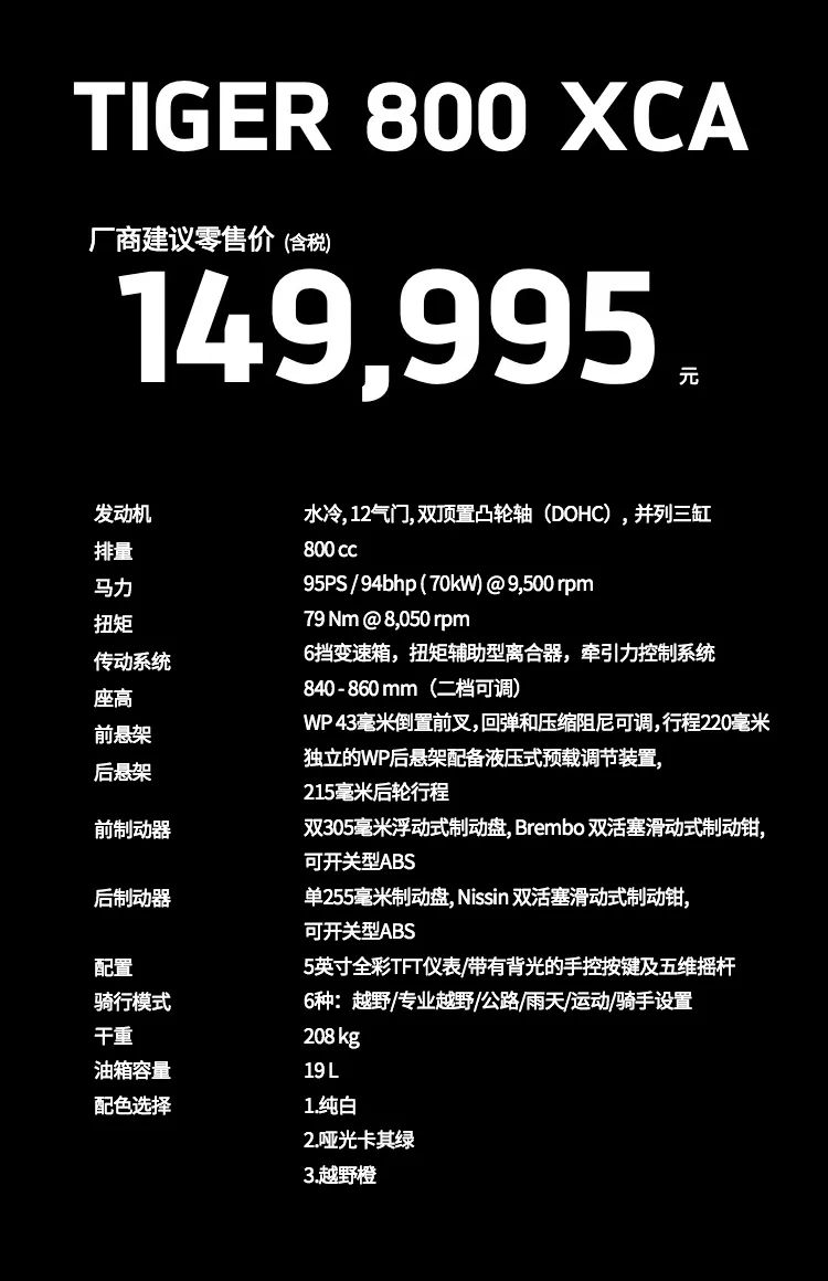 凱旋Tiger系列最大的特點(diǎn)就是版本繁多,新款的Tiger 800也不例外,分為XC系列和XR系列,XC系列更加偏向越野功能,所以全部配備的輻條輪轂,座高在840-860mm可調(diào),有XCX和XCA兩個(gè)版本,此次國(guó)內(nèi)上市的Tiger 800 XCA為高配版,擁有頂級(jí)規(guī)格的技術(shù)配置,專為極致探險(xiǎn)而打造。