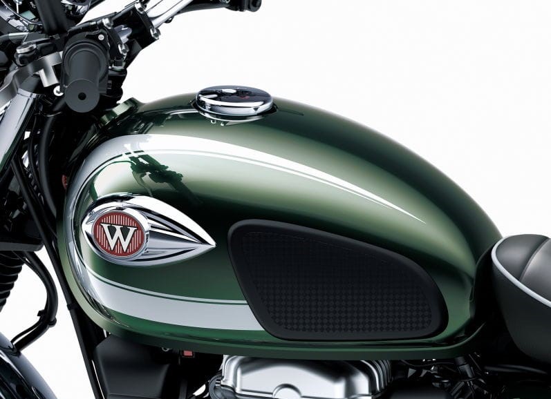 深金屬綠色燃油箱帶有鍍鉻標(biāo)志,護(hù)膝的設(shè)計與W800 Cafe相同。