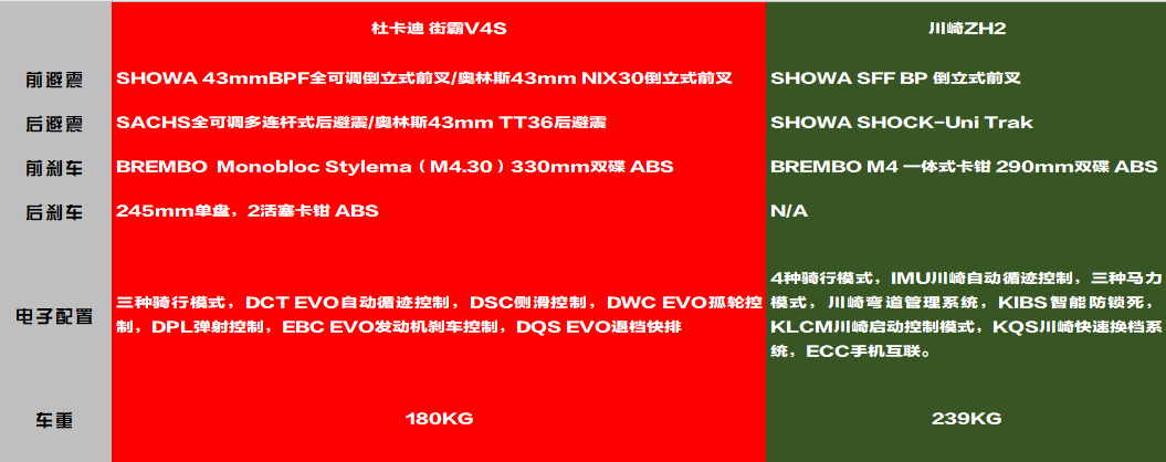 這兩款車各自為品牌旗下的超級街車,在電子配置上都非常下本錢,川崎更是為Z H2裝載了手機互聯(lián)的功能,杜卡迪V4及V4 S兩種配置,在懸掛方面區(qū)別較大,V4S車型前后懸掛均為電子調(diào)節(jié)。