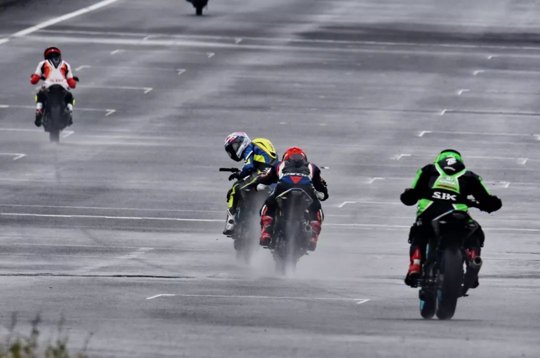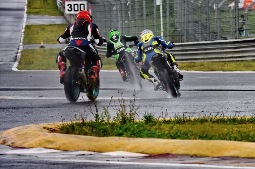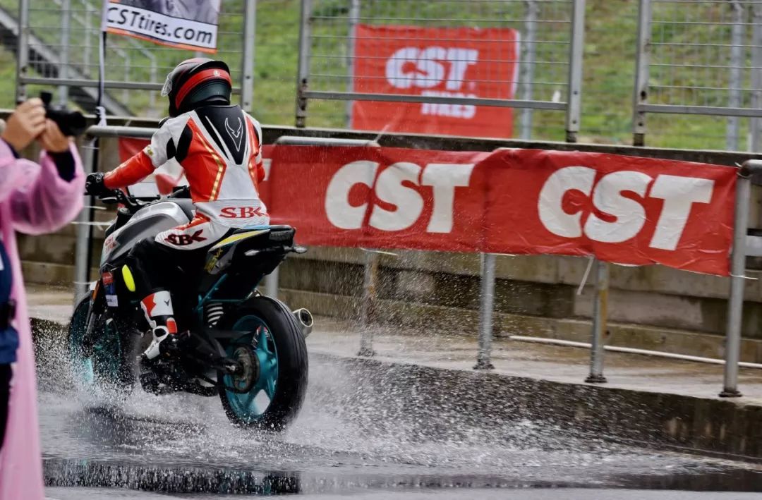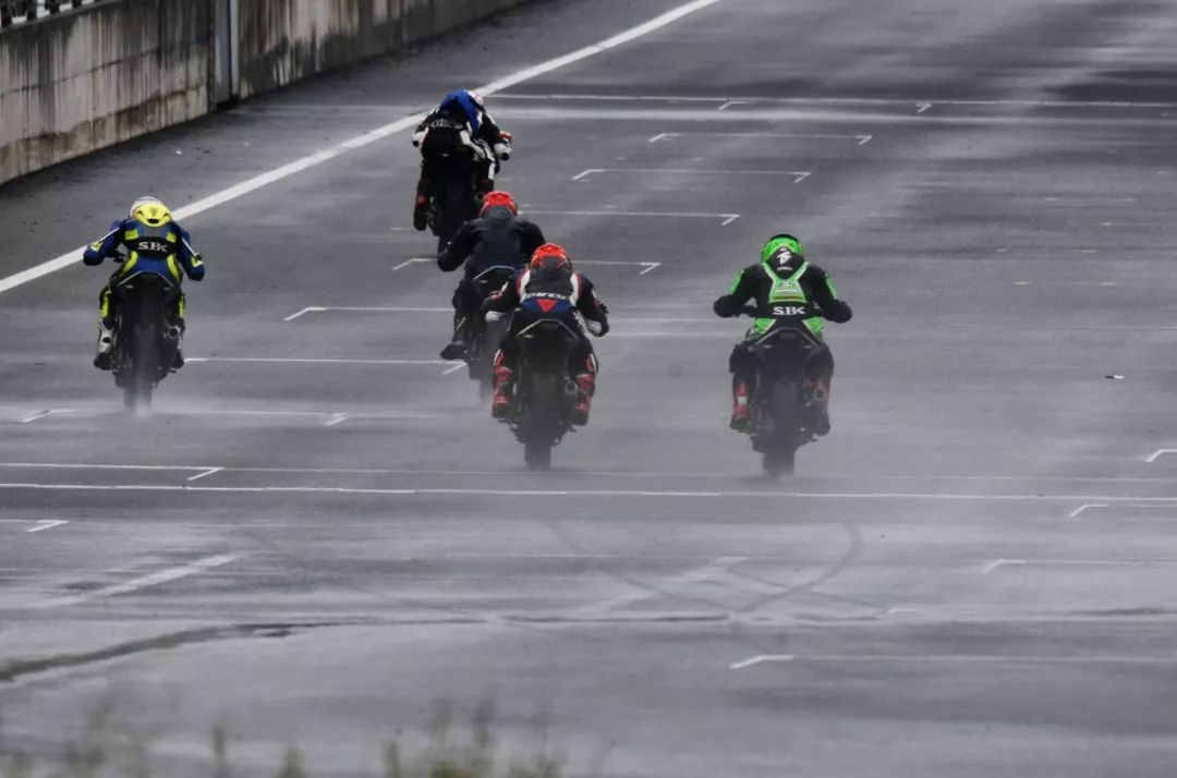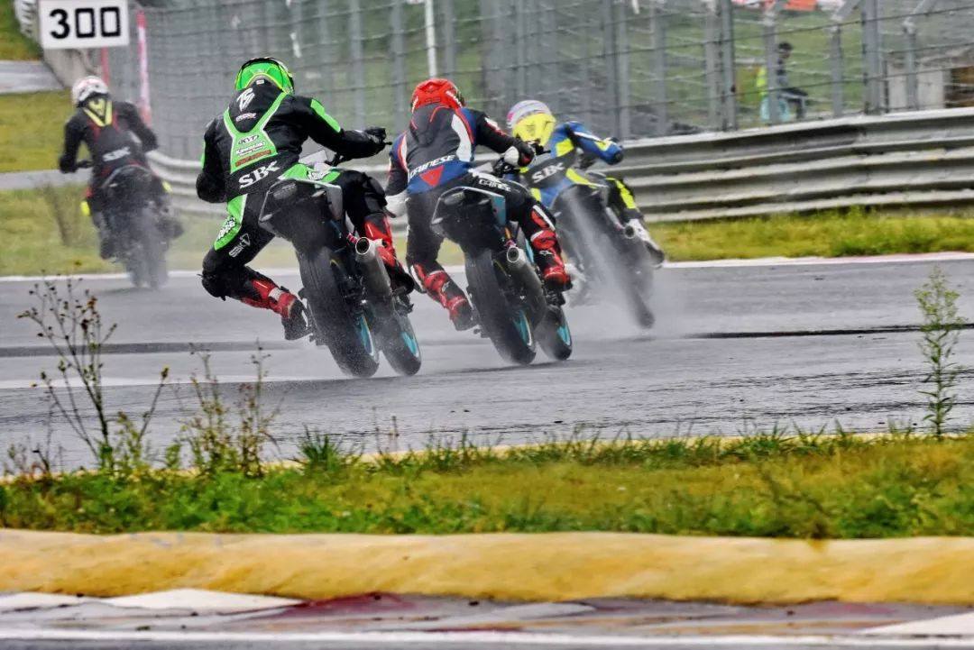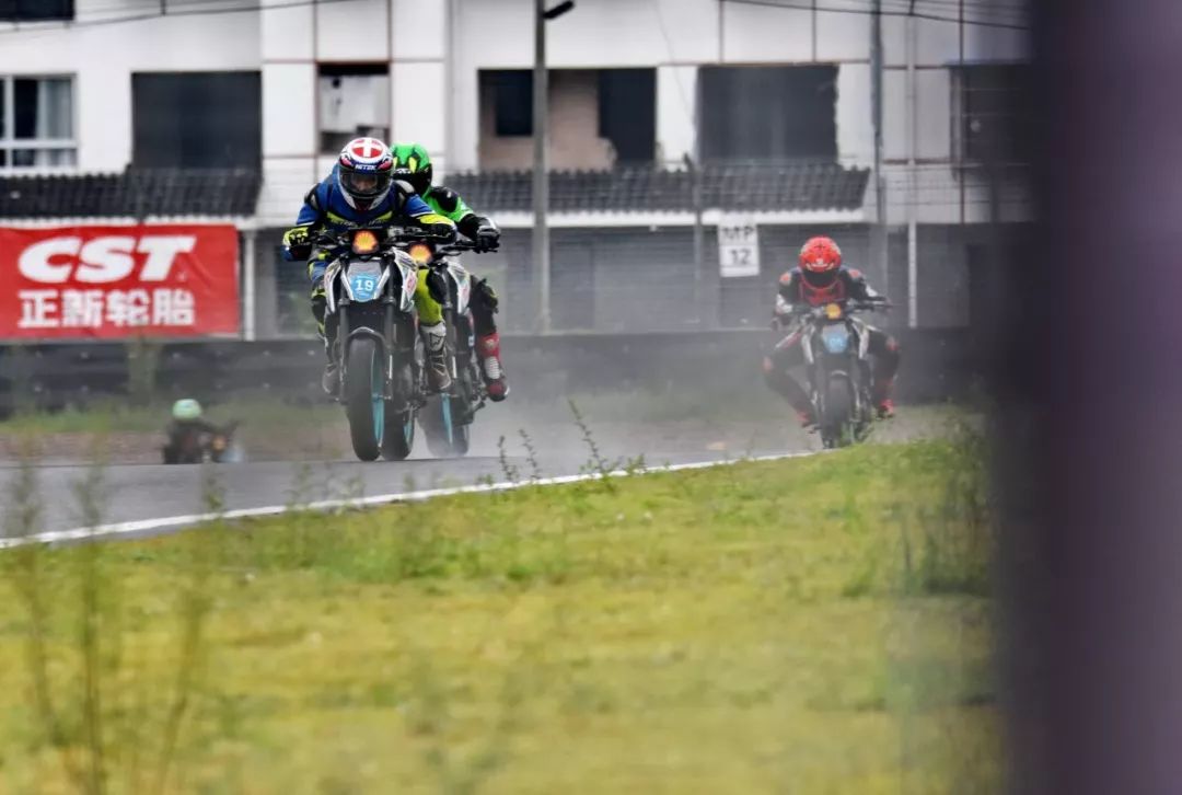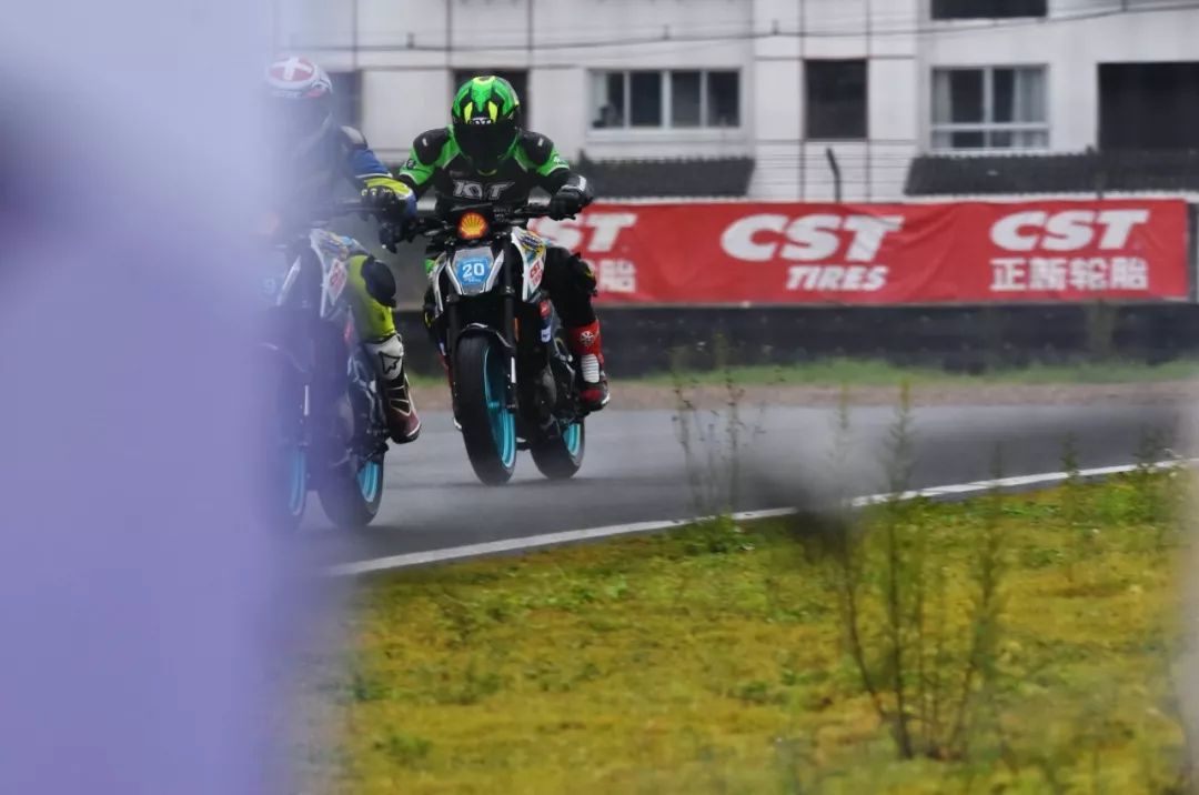 細雨綿綿、天空中水花飄舞。處于領先位置的王捷不斷往前推、似乎要一鼓作氣去拉出一段讓競爭者絕望的距離,在比賽最初的短短幾圈,他一度與后車拉出了大約 1 秒的距離。后面的程雷、李英杰、唐業(yè)昌,在濕滑的路面下奮力追趕,三人的近身追逐,成為了比賽初段的焦點。