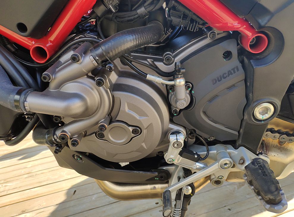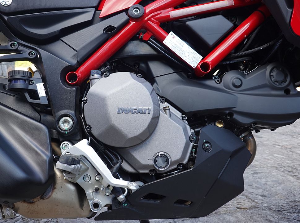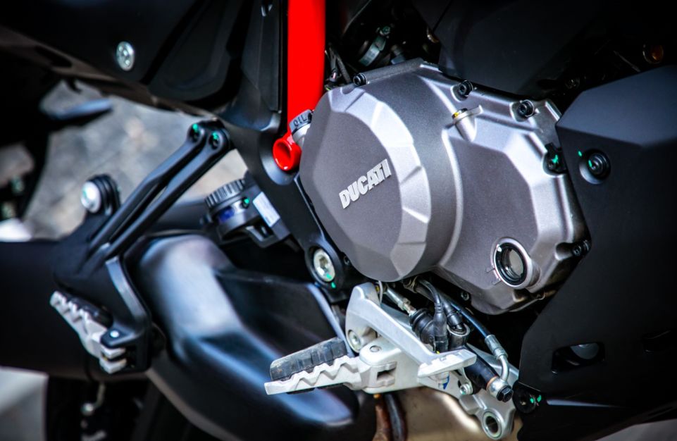 Multistrada 950搭載的是經(jīng)典的TESTASTRETTA11° L型雙缸發(fā)動(dòng)機(jī),排氣量937mL,采用了94mm×67.5mm的缸徑和沖程。在電子燃油噴射系統(tǒng)的伺服下,這臺(tái)發(fā)動(dòng)機(jī)的最大馬力為113HP(9000r/min),最大扭矩則是95N·m(7750r/min)。簡(jiǎn)單來說,這是一臺(tái)偏向于中低轉(zhuǎn)速、兼顧高轉(zhuǎn)速的發(fā)動(dòng)機(jī)。定位于多功能用途的Multistada 950,要的不僅僅是高轉(zhuǎn)速的激情,而是更加偏重于中低轉(zhuǎn)速范圍內(nèi)的動(dòng)力輸出,因而缸徑?jīng)_程比屬于比較溫和的1.39,在3500轉(zhuǎn)-9500轉(zhuǎn)的轉(zhuǎn)速區(qū)間內(nèi),這臺(tái)發(fā)動(dòng)機(jī)都可以提供80%以上的扭矩輸出。在實(shí)際試駕過程中,以100km/h速度巡航時(shí)發(fā)動(dòng)機(jī)轉(zhuǎn)速只需要4000r/min左右,顯得異常輕松。充沛的中低轉(zhuǎn)速扭矩,不必拉高轉(zhuǎn)速就能獲得強(qiáng)大的力量,這意味著出彎時(shí)更有力的加速、騎行時(shí)可以更少的換擋,公路駕駛時(shí)讓騎手感到動(dòng)力更實(shí)用、更容易獲得、駕駛樂趣更多。