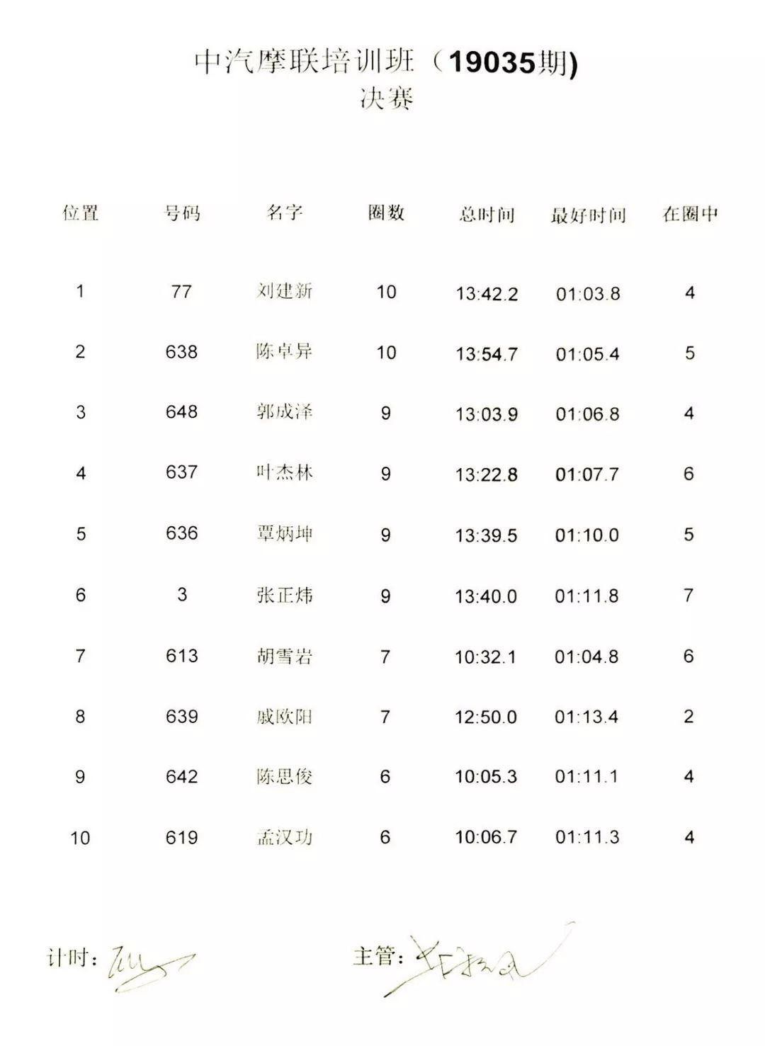 模擬賽的初段,冠軍是一場激烈的競爭,駕駛 77 號車的劉建新帶頭,與后面 638 號車的陳卓異、613 號車的胡雪巖有過一翻近身的追逐。越跑越順的劉建新到第四圈跑出了全場最快的 1 分 03.8 秒圈速,開始逐漸拉開了與后車的距離。