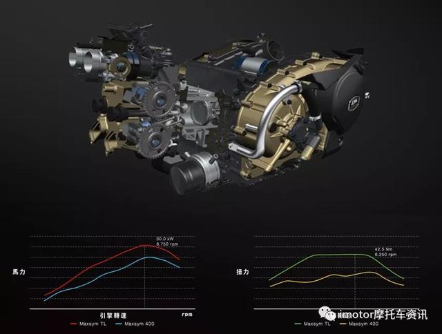 搭載三陽(yáng)全新開(kāi)發(fā)的465cc水冷DOHC 8V并列雙缸發(fā)動(dòng)機(jī),6750轉(zhuǎn)達(dá)到最大功率30kW,6250轉(zhuǎn)達(dá)到最大扭力42.5N.m,這臺(tái)發(fā)動(dòng)機(jī)的數(shù)據(jù)表現(xiàn)要比過(guò)去的三陽(yáng)MAXSYM400要提高不少。