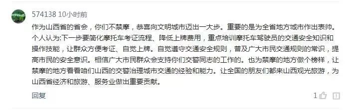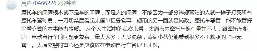 網(wǎng)友“用戶70466226”:不能因為有一部分違規(guī)駕駛的情況而一棒子打死所有摩托車駕駛員,一刀切就是懶政的體現(xiàn),在太原市摩托車保有量不大的情況下,太原交警的重心應(yīng)該放到電動自行車的管理上。
