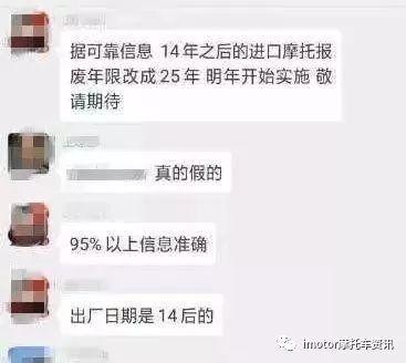 隨著摩托車制造業(yè)技術(shù)的進(jìn)步,摩托車的質(zhì)量也在逐步提升,以往通路車型幾千塊,13年報(bào)廢可能大家都無(wú)所謂。但是目前隨著大貿(mào)和大排量車型的普及,基本都幾萬(wàn)到幾十萬(wàn),如果還是13年期報(bào)廢,意味著你保養(yǎng)再好貶值速度照樣飛快。所以2019年初就有下面來(lái)自相關(guān)車管所的聊天記錄傳出: