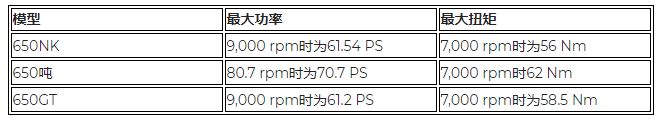 CFMOTO 300NK搭載292.4cc的單缸,水冷,DOHC,4氣門發(fā)動(dòng)機(jī),在7200轉(zhuǎn)提供33.9 PS的峰值功率,在8800rpm時(shí)提供20.5Nm的最大扭矩。650系列使用649.3cc并列雙缸水冷發(fā)動(dòng)機(jī),在下表中可查看650車型的峰值功率和扭矩?cái)?shù)據(jù):