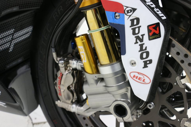 HP4 Race采用的是Ohlins SD052前叉,后部是Ohlins TTX 36 GP減震器。前制動(dòng)為320 mm的雙制動(dòng)盤(pán)匹配Brembo鈦合金GP4-R制動(dòng)鉗,后制動(dòng)是220mm單制動(dòng)盤(pán),Brembo鈦合金4活塞卡鉗。