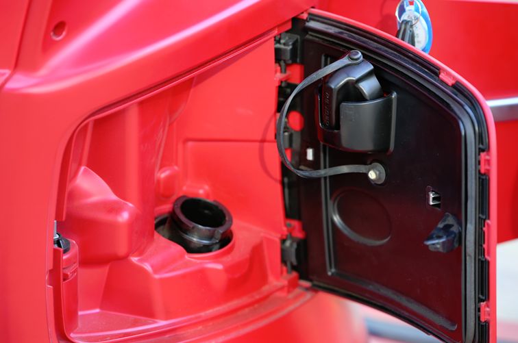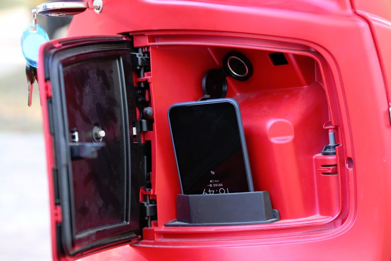 Django 150的中控鎖集成了電門開關(guān)、坐墊鎖和龍頭鎖。前置儲(chǔ)物空間的位置在下部,由此省出了非常大的膝部空間,筆者189cm的身高騎乘Django 150,膝部空間在轉(zhuǎn)向時(shí)也很充裕。前儲(chǔ)物空間需要鑰匙開啟,將鑰匙插入位于前掛勾下方的鑰匙孔并左、右轉(zhuǎn)動(dòng),可分別開啟左右兩側(cè)的前置儲(chǔ)物箱。加油口被設(shè)計(jì)在左前儲(chǔ)物箱內(nèi),有一個(gè)貼心設(shè)計(jì)值得一提,加油時(shí)放置油箱蓋的固定卡位被設(shè)計(jì)在左前儲(chǔ)物箱蓋門上。右前儲(chǔ)物箱內(nèi)有一個(gè)12V點(diǎn)煙器接口,下部還有一個(gè)可以放置手機(jī)的固定槽。