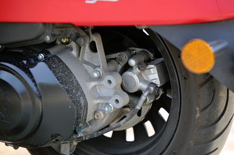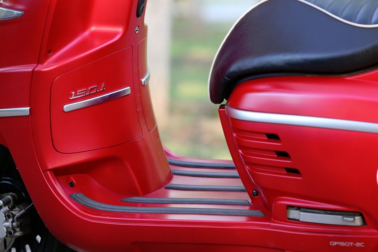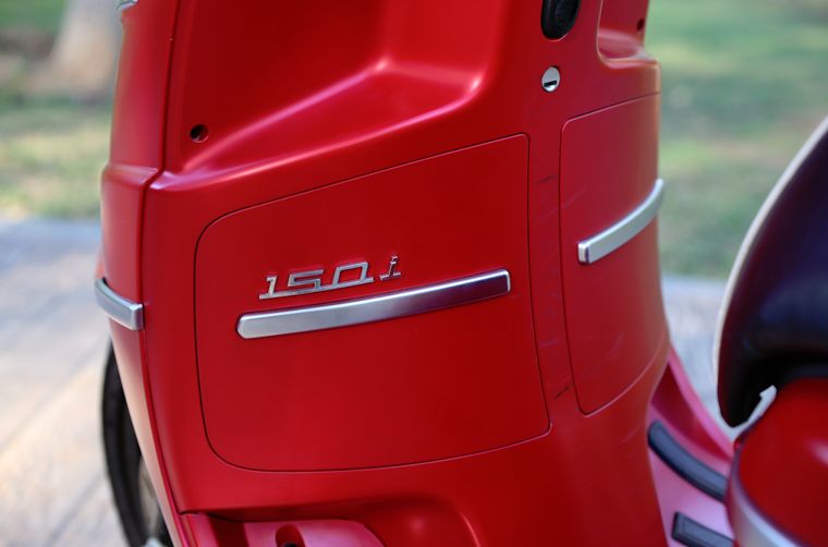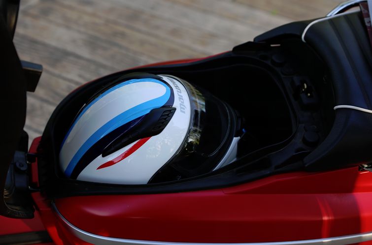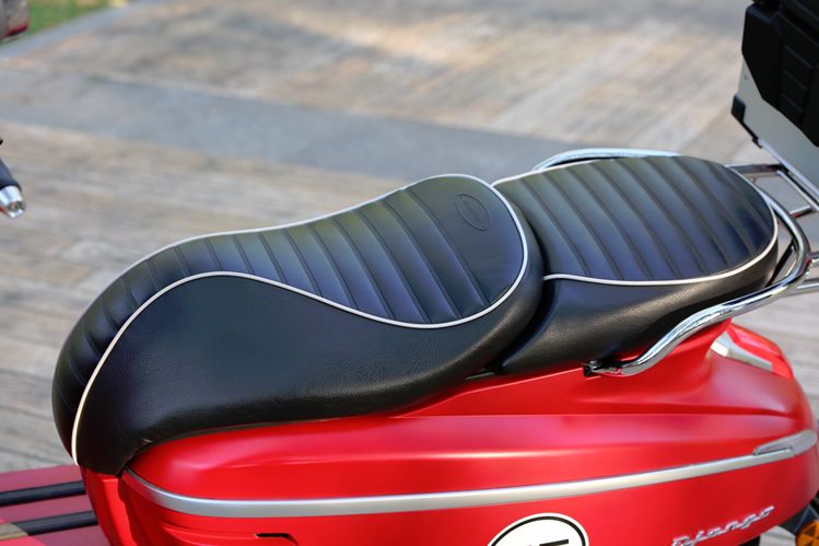 Django 150復(fù)古式樣的分體坐墊,采用黑色皮革材質(zhì)包覆而且做工十分細(xì)膩,凹凸有致的線型與車身整體曲線完美搭配。前坐墊打開后,座桶空間可以完全放置一頂全盔,這樣的儲(chǔ)物表現(xiàn)非常不錯(cuò),更何況是一款復(fù)古踏板。