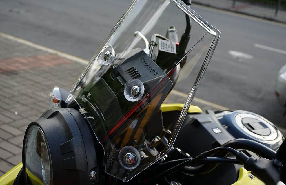 DL250風(fēng)擋不可調(diào)節(jié),面積大小一般,如果經(jīng)常長(zhǎng)途奔襲的話,后期很有改裝的必要。