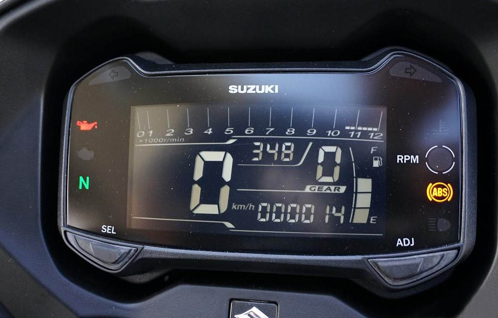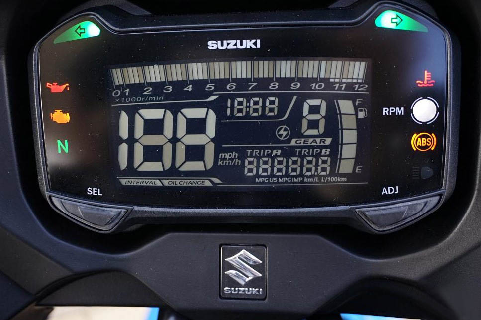 鈴木宣稱,這塊儀表是,豪華汽車級別的負顯儀表,即使在白天強光照射下,也能保證字體清晰,易于識別。實際上是這塊儀表要吐槽一下,整個儀表界面設(shè)計的過于凌亂尺寸偏小,信心顯示非常擁擠,一些信息在騎行過程當中比較難辨識。